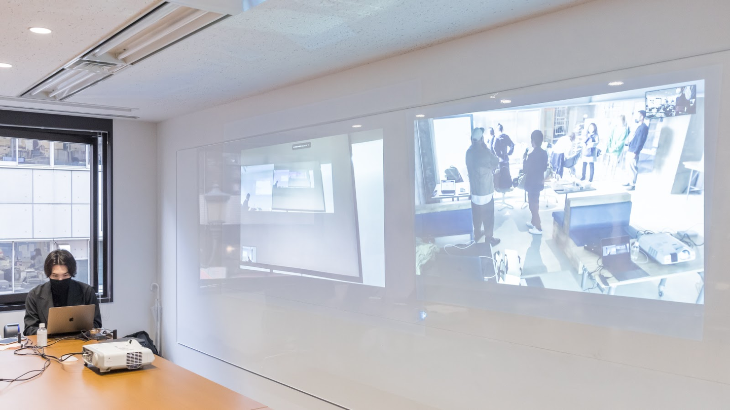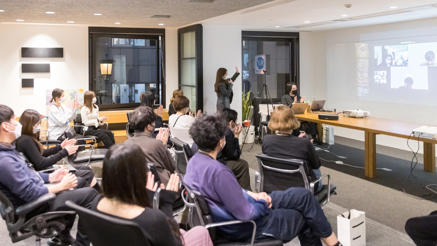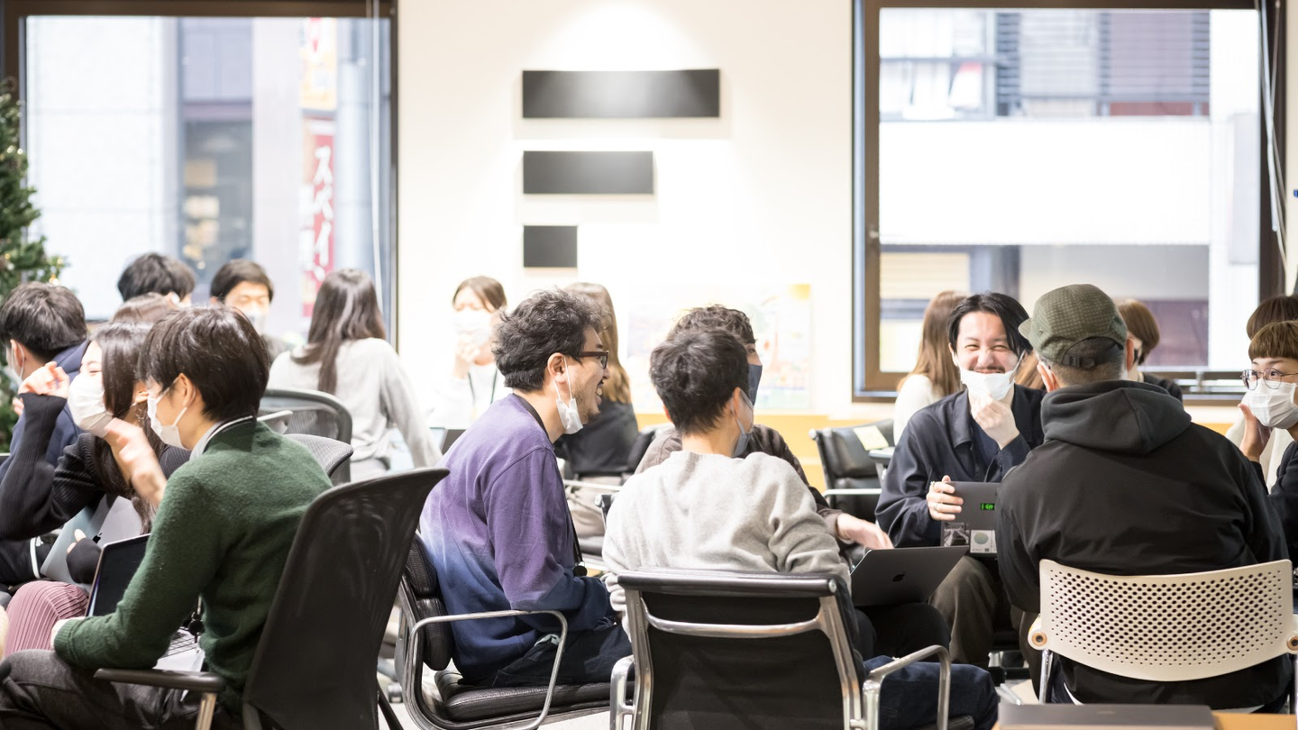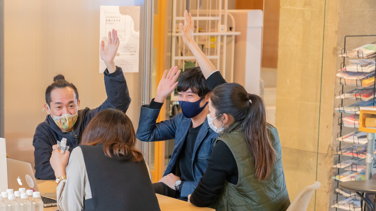 2020年の年末全社会は完全オンラインで行われましたが、感染対策をしっかりとしつつ、オフラインとオンラインのハイブリッドで企画された今回。オフラインで東京オフィスと京都オフィス、そして各自宅からのオンラインの3拠点で行われ、事前に出社か在宅かの選択ができました。2021年春、CONCONに移転した京都オフィス。メンバー全員が距離感を持って集まることができるよう、今回は『KAGAN HOTEL』のスペースをお借りしました。