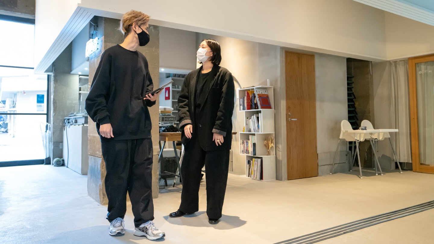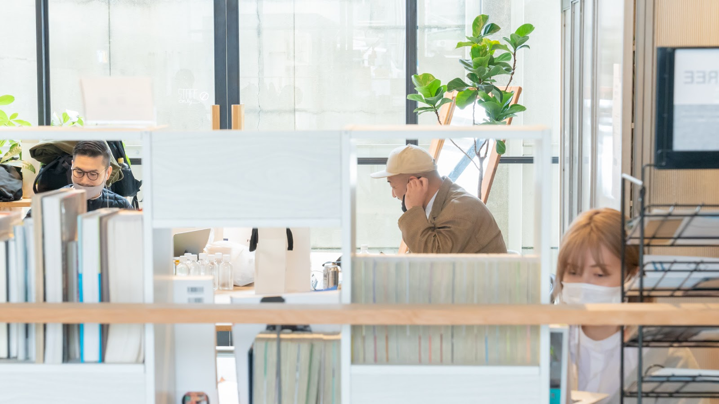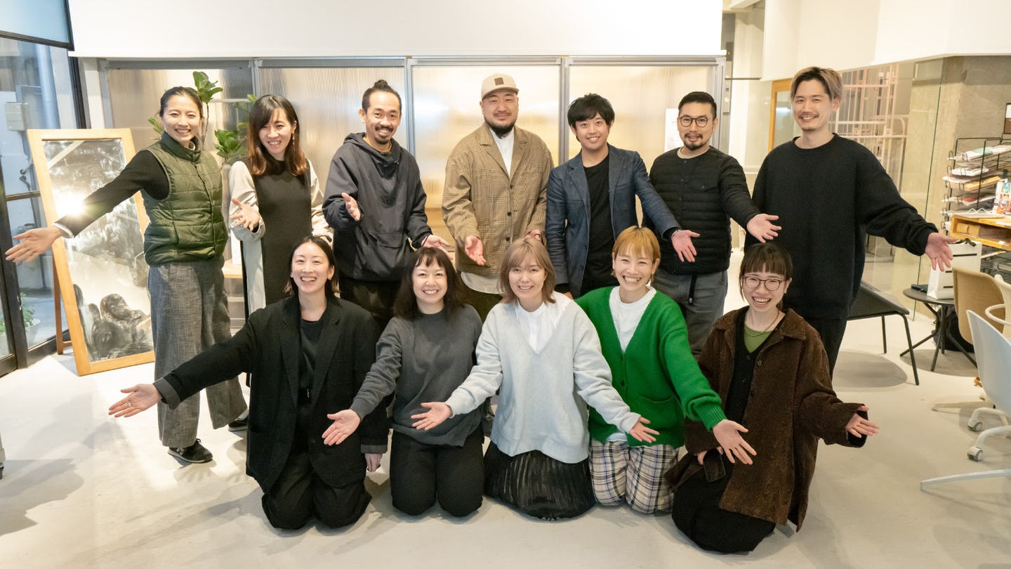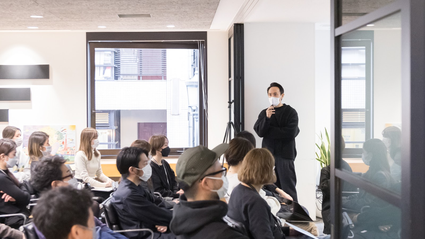 2020年の年末全社会は完全オンラインで行われましたが、感染対策をしっかりとしつつ、オフラインとオンラインのハイブリッドで企画された今回。オフラインで東京オフィスと京都オフィス、そして各自宅からのオンラインの3拠点で行われ、事前に出社か在宅かの選択ができました。2021年春、CONCONに移転した京都オフィス。メンバー全員が距離感を持って集まることができるよう、今回は『KAGAN HOTEL』のスペースをお借りしました。