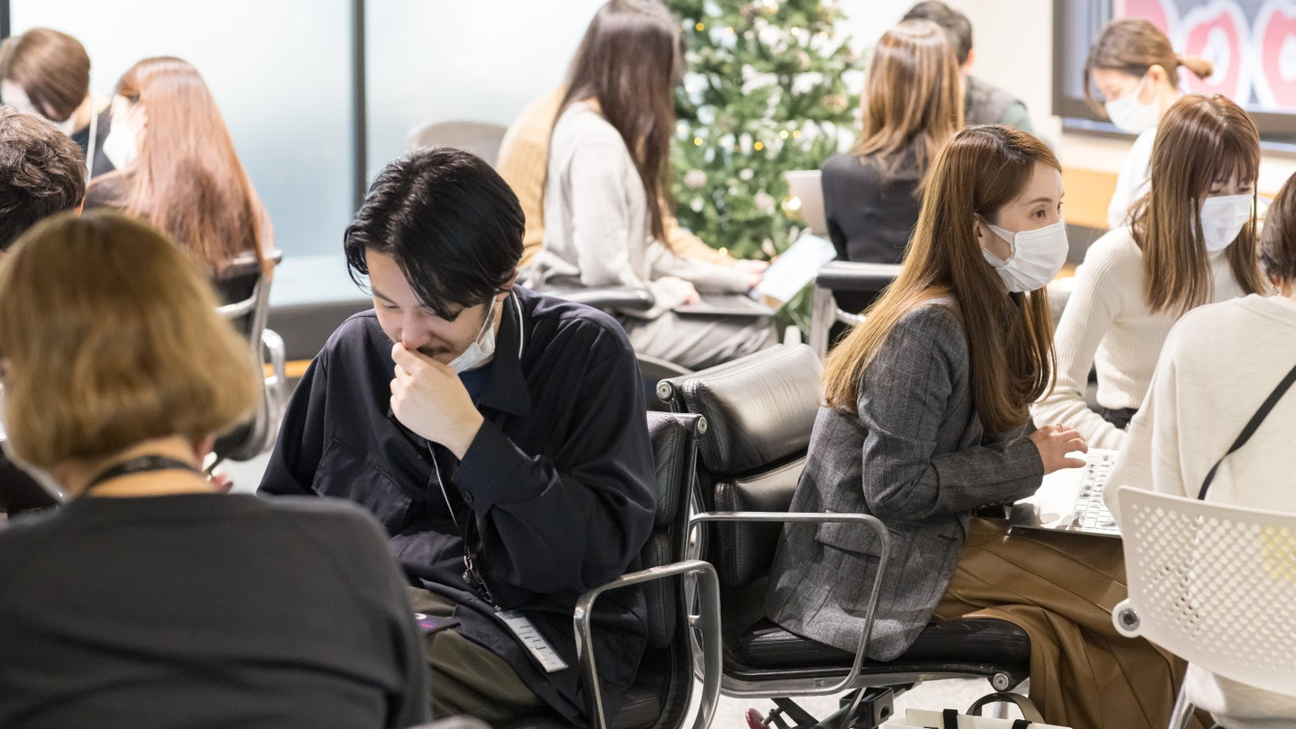 休憩を挟み、開催されたのは全員オンライン参加でのゲーム企画『ワードウルフ』。ワードウルフとは、みんなでお題について話し合い、「みんなとは異なるお題」を与えられたひとりのウルフを探し出すゲームです。先ほどの企画はオンラインとオフラインの各拠点ごとでしたが、拠点という垣根を超えたコミュニケーションができるよう、Zoomを使用して行われたこのゲーム。オンラインという利点もあり、各自オフィス内に分散して思い思いの場所から参加しました。