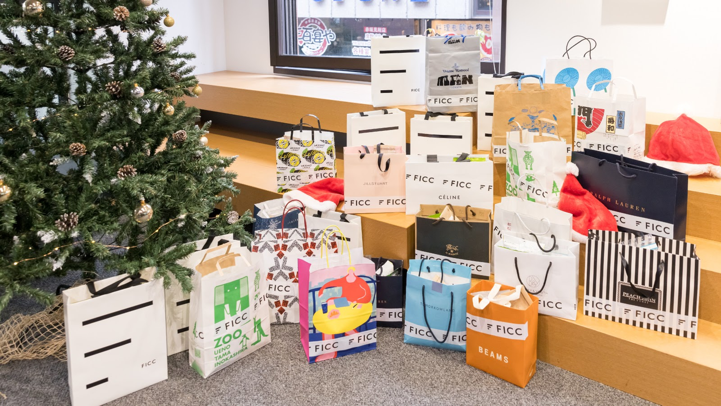 ギフトが入った袋は、少しだけ環境のことを考えて、メンバーが持ち寄ったショップバックをリユースしたもの