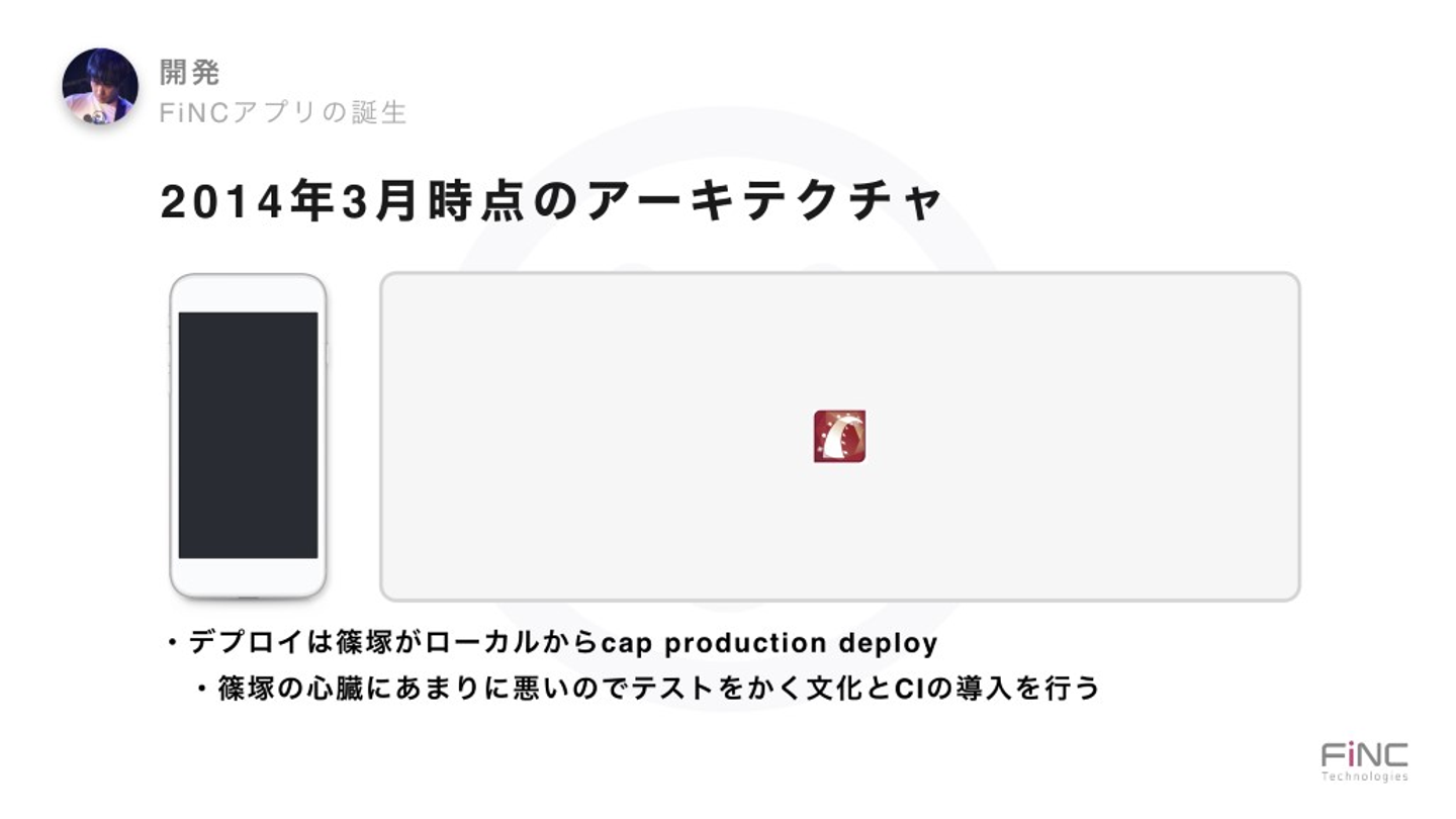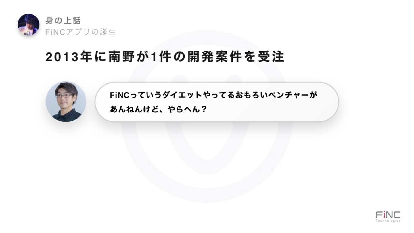 FiNCアプリの開発の歴史は2013年に遡ります。2013年当時、私は大学院に身を置きつつ、現FiNCの代表取締役 CTOの南野や友人らとともに自分たちでシステム開発の会社を営んでおりました。その会社で受託案件として受けたのがFiNCアプリの開発でした(図2)。