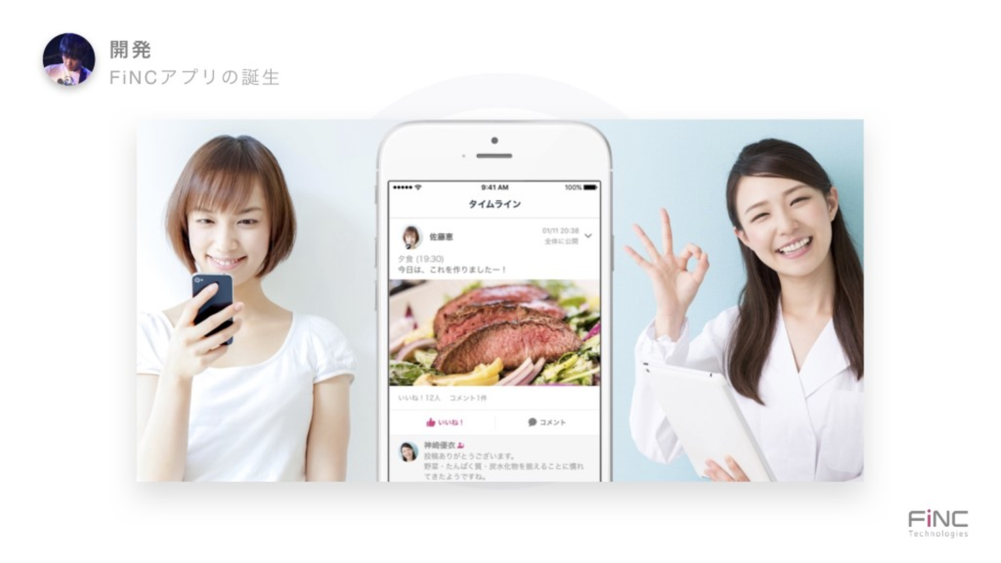 「FiNC ダイエット家庭教師」の開発中に溝口と話す機会がありました。溝口からは、ジムのトレーナーの経験を通して日本の健康課題を目の当たりにしたこと、健康課題を解決するためにまずは1対1のダイエット指導を通した生活習慣改善に取り組むが、まだまだ解決すべき問題は山積みであるということを聞きました。健康指導を行うことが可能なプロフェッショナル人材と機会の不足、各種検査へのアクセシビリティの低さ、信頼性の低い健康情報の氾濫、健康商品の入手困難さ、孤独死やコミュニティの重要性、法人従業員の不定愁訴と生産性の低下、などなど。そして、これらの問題を解決するためのサービスを提供し、ヘルスケアのプラットフォームを構築したいという旨を聞きました。