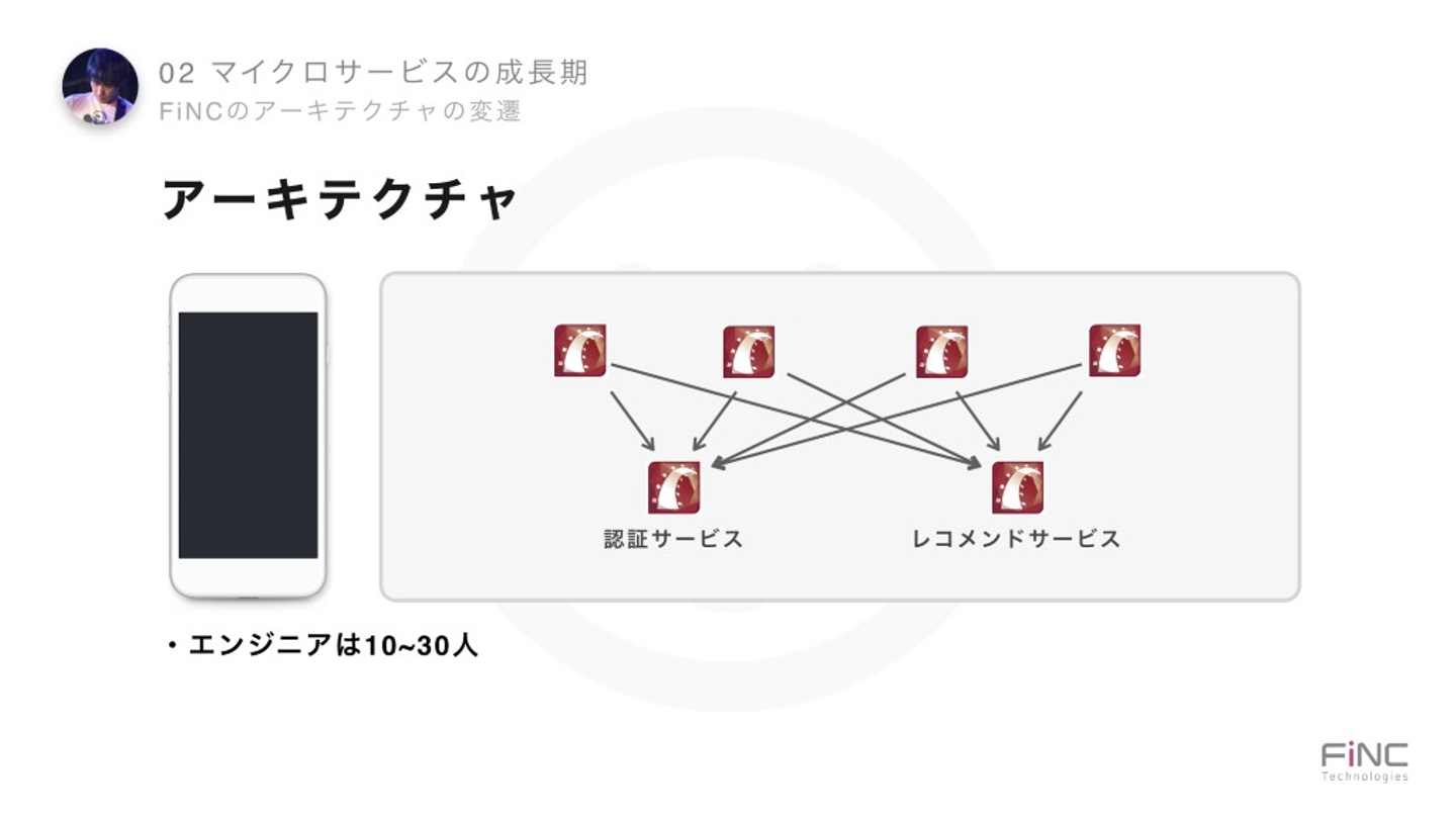 今でこそFiNCは「マイクロサービスの採用」を打ち出して、40を超えるマイクロサービス、50人以上のエンジニア組織となりましたが、サービスの開始当初はもちろん1つのサービス、数名のエンジニアしかいませんでした。FiNCが現在のアーキテクチャに至るまでにさまざまな課題に直面し、技術的にも組織的にも変革をする必要がありました。
