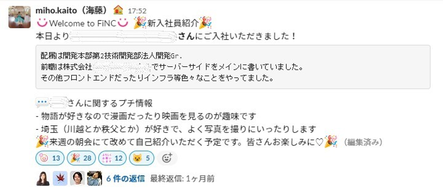 リモートワークが始まると、直接会って話をする機会が減ってしまいます。入社日にはなるべく多くの社員と顔を合わせて「入社おめでとう!これからよろしくね!!」を直接伝えたい。そして、「FiNC社員の空気感を肌で感じてほしい。」という想いがあるのです。