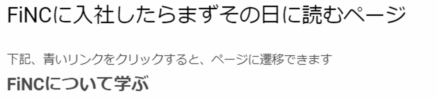 その他、社員として絶対知っていてほしい!という情報は、「FiNCに入社したらまずその日に読むページ」を準備しています。初日の研修では説明しきれない、けれど読んでほしいものをまとめています。