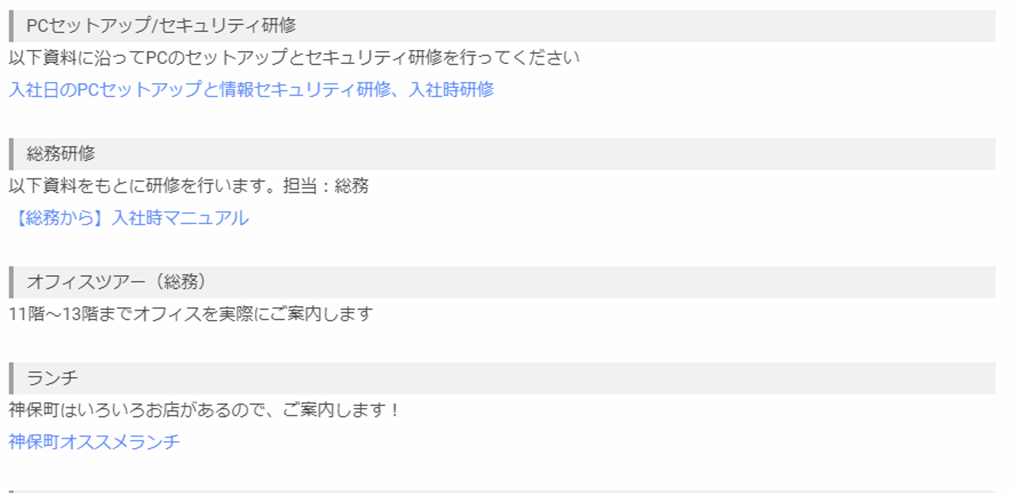 それぞれのテーマごとに関連リンクを貼っておきます。これなら、「あ、総務の担当者に聞いたことあるなぁ」となったらいつでも自分で復習できますよね。