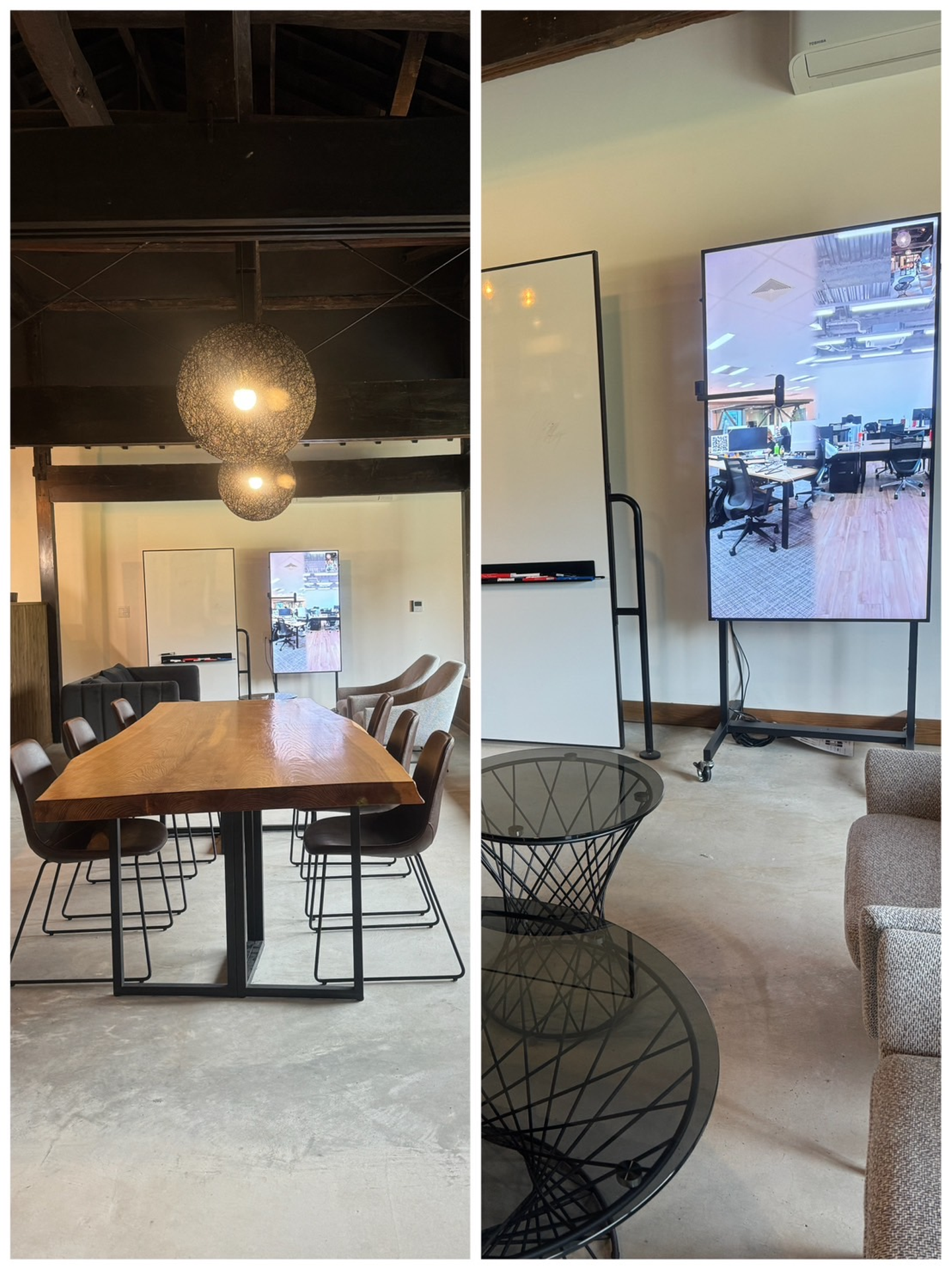 開放的なガラス張りの引き戸で圧迫感がなく、ストレスフリーな会議室です🌳(照明も素敵✨)