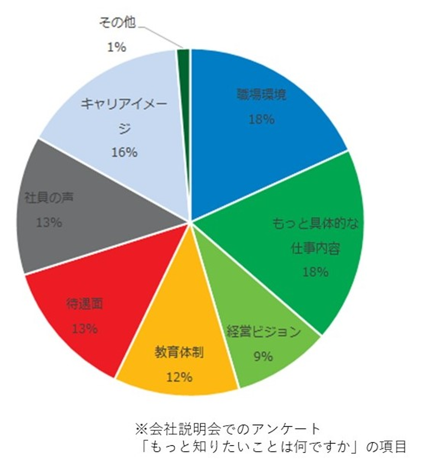しかし、会社説明会でのアンケートでの「もっと知りたいことはなんですか?」という質問では、「職場環境」「もっと具体的な仕事内容」「キャリアイメージ」と働くイメージをつけるための項目が不足していました。