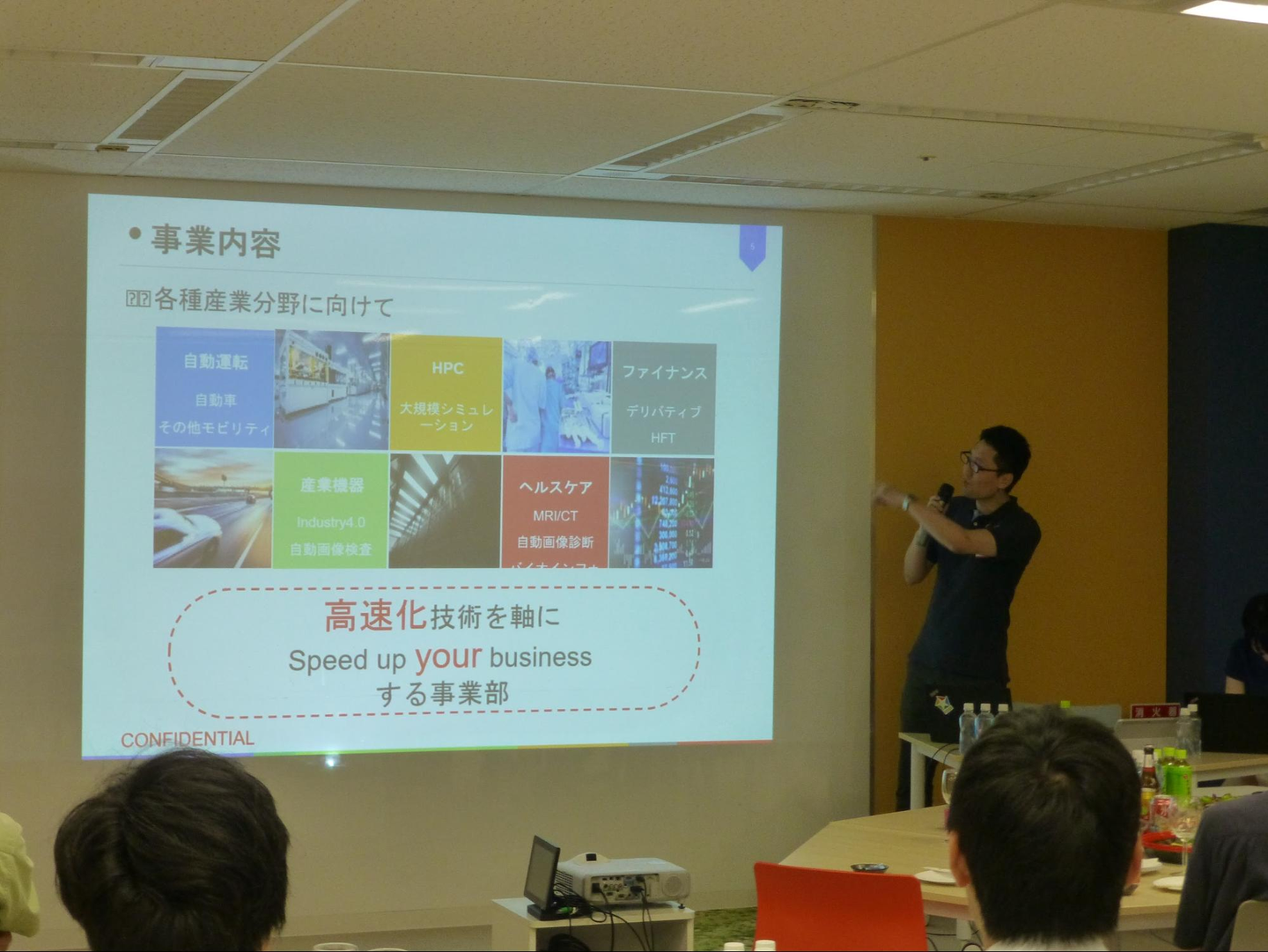 内容としては「通常のSWサービス(高速化, アルゴリズム開発など)における一般的なワークフロー 」と「ソリューション事業部における今ホットな技術、今後ホットになりそうな技術 」についてお話いただきました。