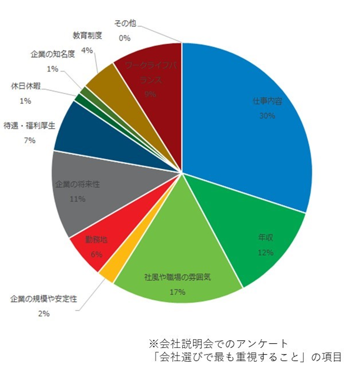 結果として(会社説明会に参加された方の)重視することは「仕事内容」がダントツで多く、次点に「社風や職場の雰囲気」と回答されています。