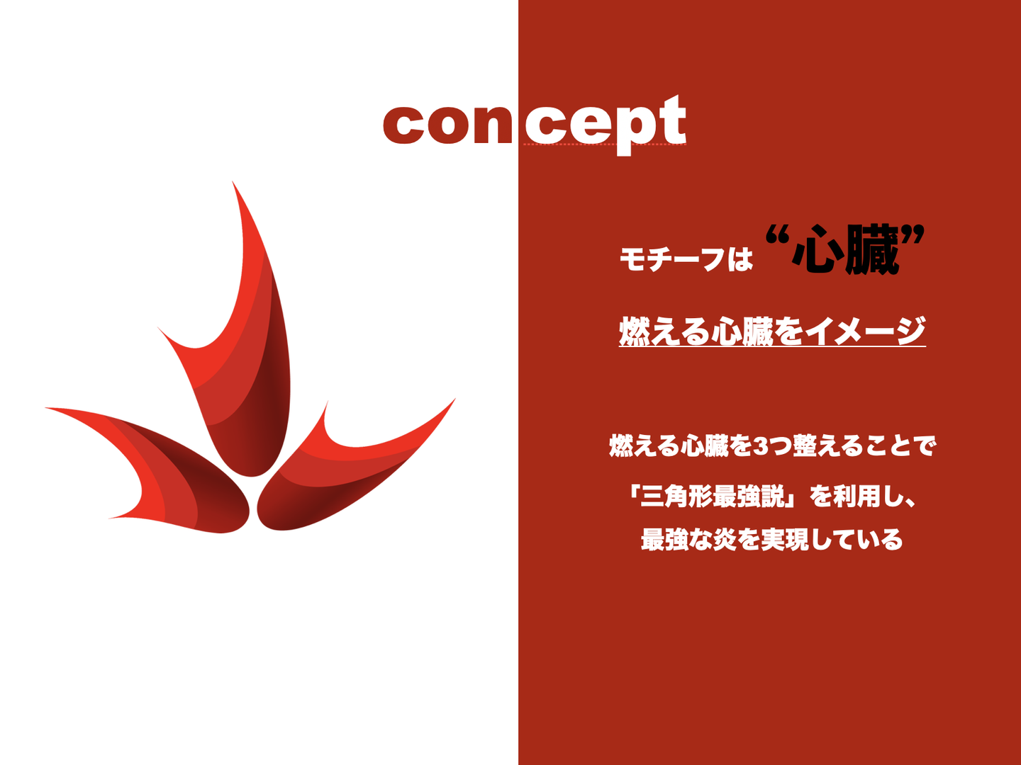 そしてコンセプトはもう一つ。『三角形』というキーワード。最初に作成していたロゴは一つの心臓をモチーフにしたものでした。それだけでは、なぜワクワクしているのか?本当に動き続けることはできるのだろうか?このバランスの取れたメンバーの関係性を企業ロゴに表せているだろうか?と自問自答の嵐が私の中で起こっていました。そんな思いから、どのようにしたら力強く、バランスの取れたものが出来上がるのか?とリサーチを始めました。