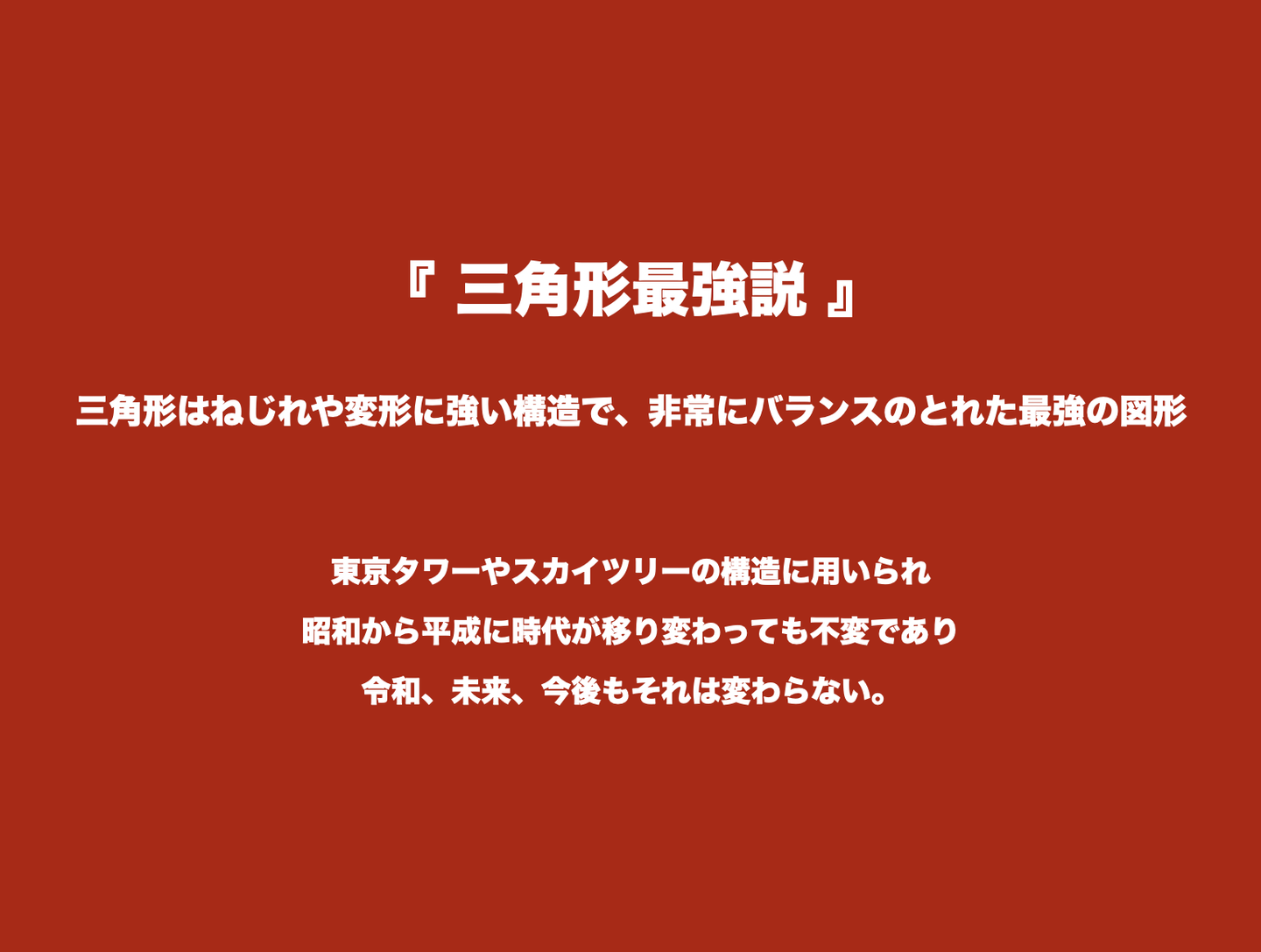 この三角形最強説を利用した日本の建築物を見つけた時、「これを取り入れたい」そう思いました。そしてさらに試行錯誤を加えて現在の形に至りました。