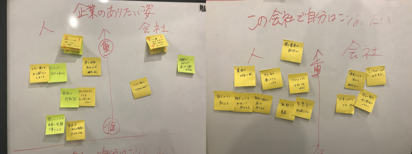 そして後日、彼らに半日ほど時間をもらい、会社に対する自分の気持ちやこんな会社で働きたいという将来のビジョンを言葉にしてもらうワークを受けてもらいました。