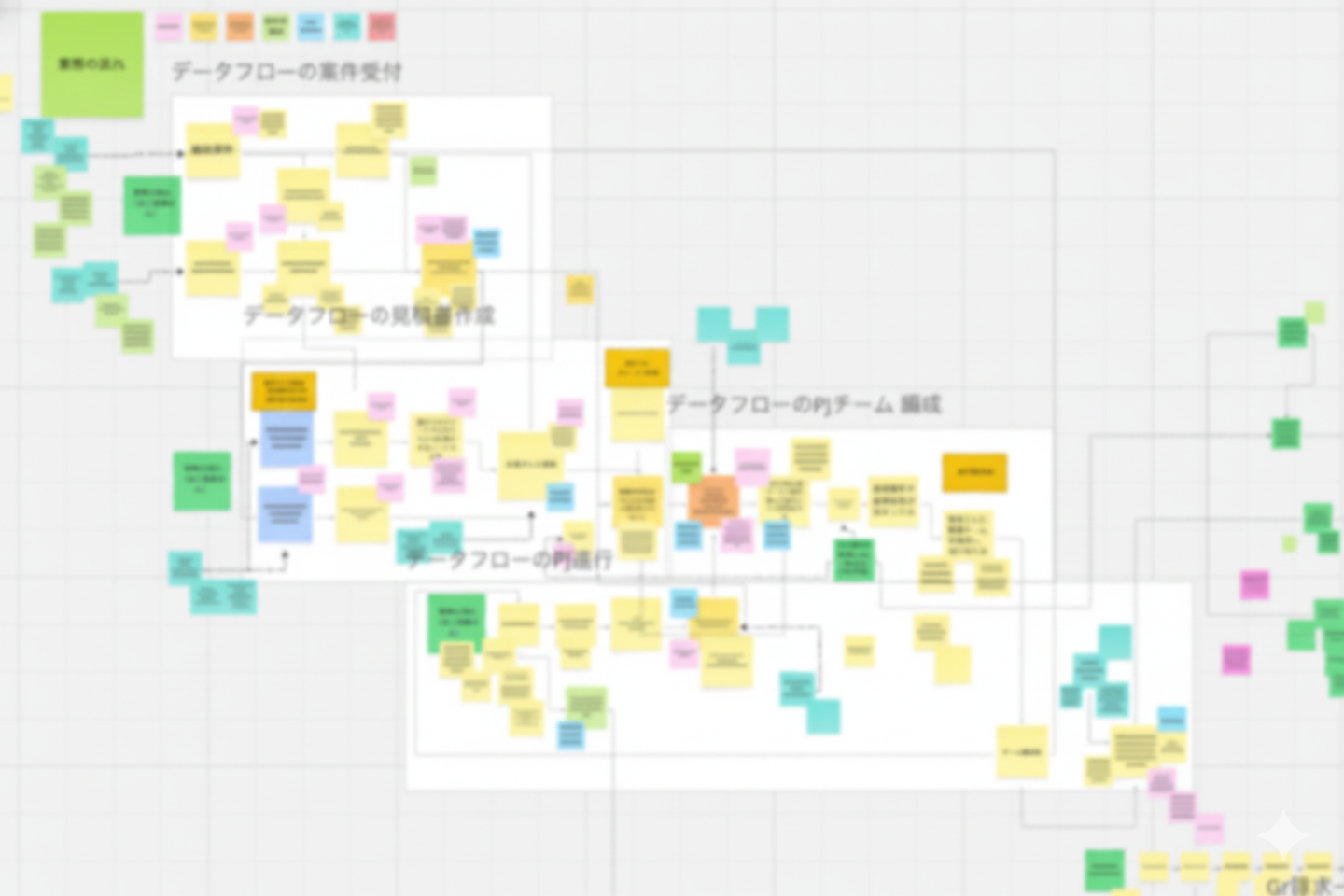 お客さまに提案⇒受注⇒チーム構築⇒納品⇒請求というシステム開発事業等の業務の流れに関し、社内の誰がどのように関わり、どのようなやり取りが行われているのか?整理されたドキュメントが存在していなかったため、不明点を現場の担当社員に確認しながら、以下の様に可視化を行っていきました。