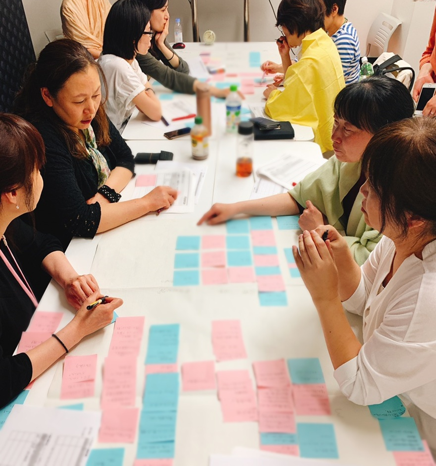 写真は、「問題整理・解決」にアプローチする研修の場面です。”病児保育のサービス向上提案”をケーススタディとして扱い、プロジェクトを模擬的に提案するワーク。目的の整理、実行すること、承認者や協力者の巻き込みに必要な情報の言語化を実践しました。日頃の業務に即した事例を題材にすることで、実際体験した成功事例や躓きの経験と結びつけ、理解を深め実践に移しやすくする効果を狙います。