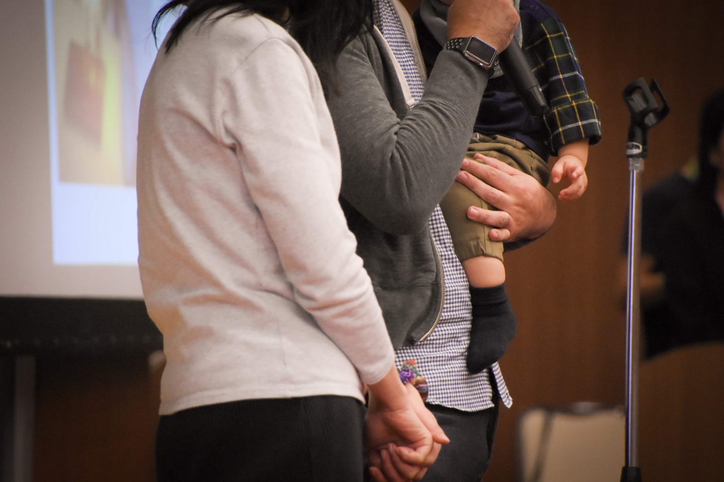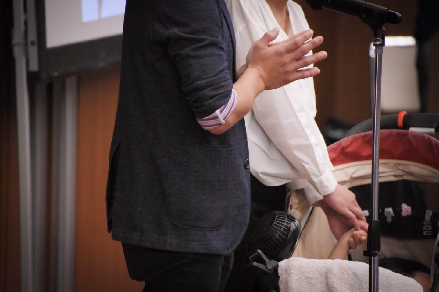 初めて赤ちゃんを迎えられた時の映像が流れた後、お子さんと共に登壇されました。