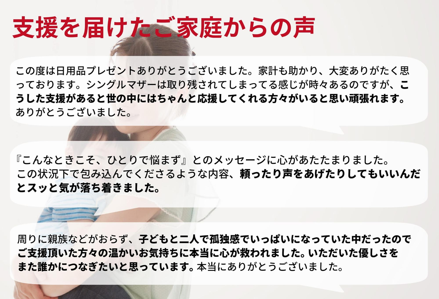 医療物資の充足をうけて、障害児家庭への支援は終結しますが、引き続き「経済的に厳しい子育て家庭」と「ひとり親家庭」に継続的な支援を届けていきます。