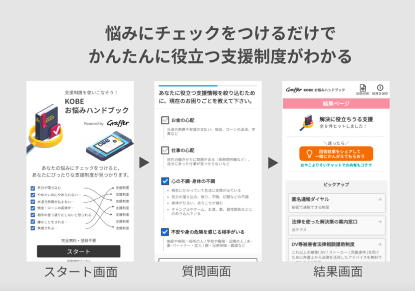 グラファーが運営する「お悩みハンドブック」は、悩みにチェックを付けていくだけで簡単に役立つ支援制度がわかるサービスです。今回は、神戸市在住の子育て世帯の方向けに「KOBE お悩みハンドブック」を共同開発し、それを活用したデジタルソーシャルワークを「おやこよりそいチャット」上で提供します。
