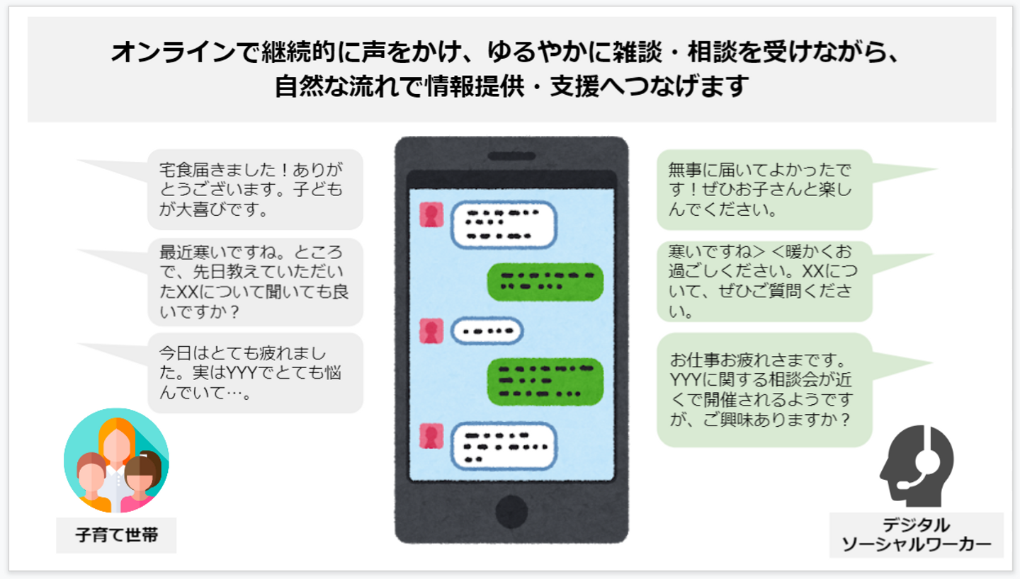 ※「おやこよりそいチャット」事業は、2021年6月30日に神戸市とBE KOBE ミライ PROJECTの協力を得ながら、新型コロナウイルス感染症の影響等で生活が厳しい状況にあるにも関わらず支援につながっていない神戸市内の子育て世帯に、食品を届ける「神戸こども宅食プロジェクト」等をきっかけにつながり、SNSでの情報提供・相談支援等により必要な支援につないでいくデジタルソーシャルワークを実践するという形で始動した事業です。