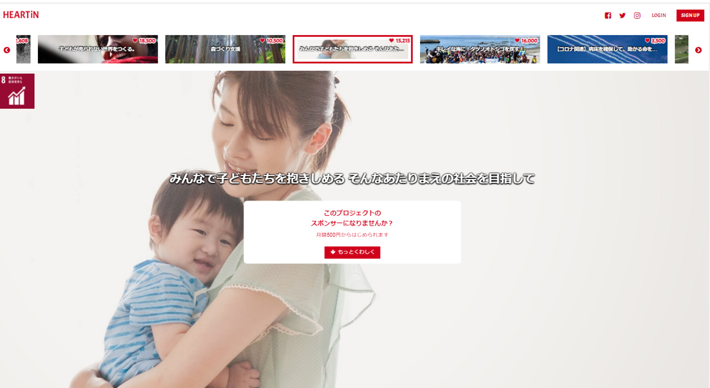 「ハーティン」はクリック数に応じた金額が寄付される、クリック募金サイトです。1つのプロジェクトに対し、1日1人1クリックすることができます。