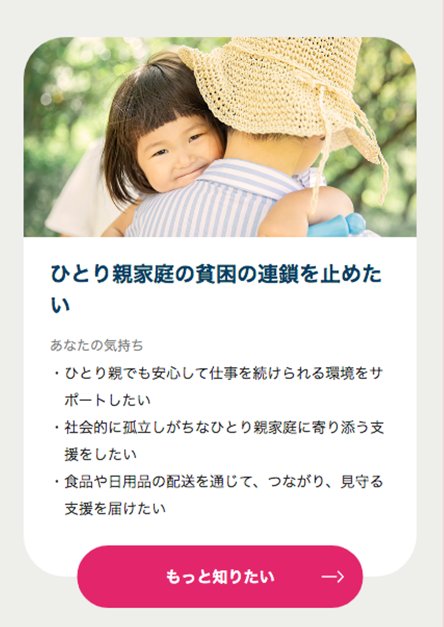「もっと知りたい」をタップして次へ進みます。ちなみに筆者は「ひとり親家庭の貧困の連鎖を止めたい」を選びました。その理由は、身近にシングルマザーの友人がいること。彼女をとりまく環境の厳しさに、何かできることはないかと思うことが多かったからです。
