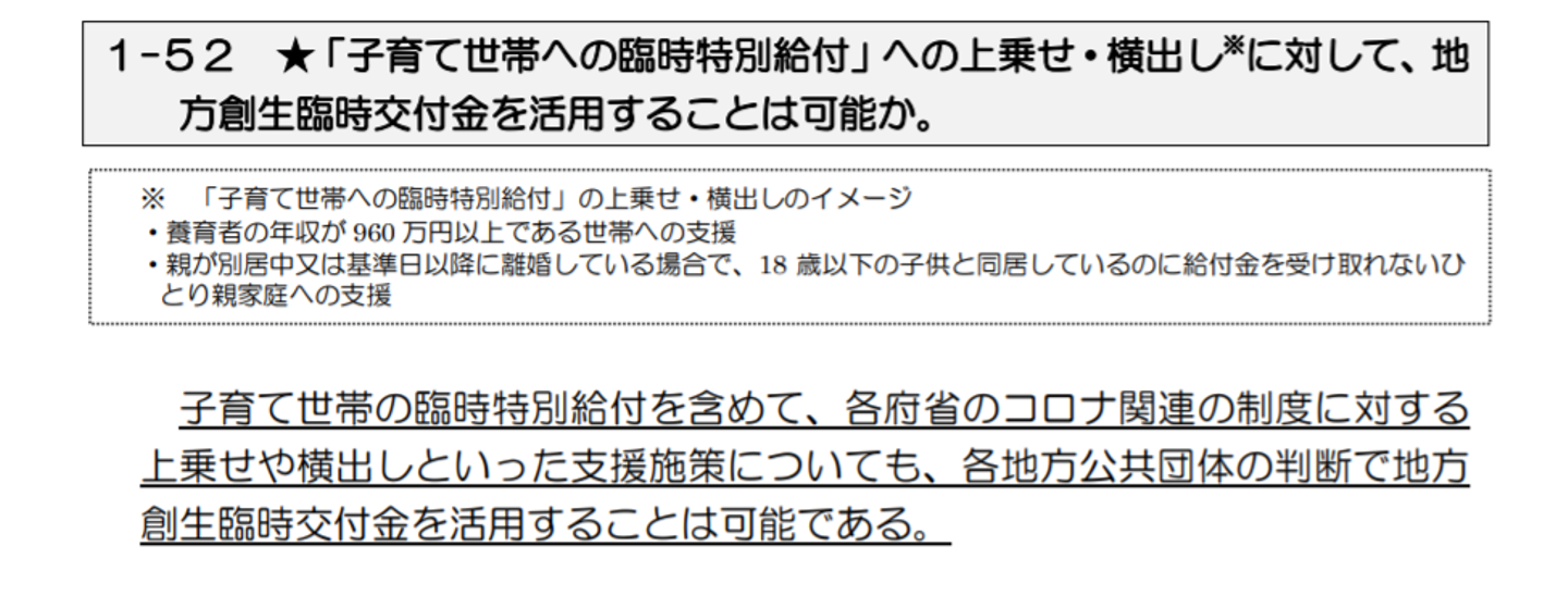 注3:以下の通り、内閣府は2021年12月27日に、自治体に対するQ&Aで新型コロナウイルス感染症対応地方創生臨時交付金を、今回の給付金の上乗せ・横出しに活用することが可能であるとの通知を示しています。