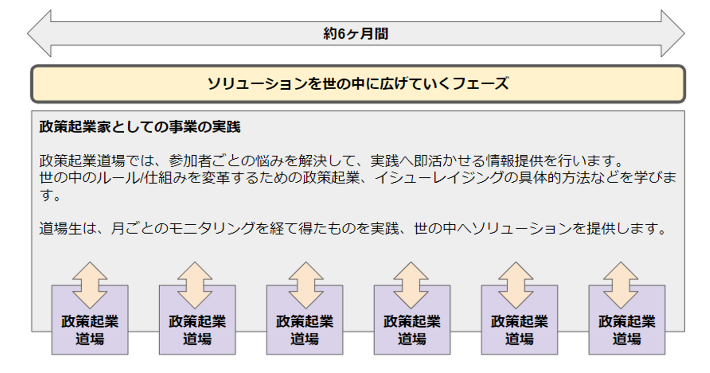 1か月に1回、5人の塾生が集まる政策起業道場を開催し、政策起業家としての事業の実践を駒崎弘樹がサポート。参加者ごとの悩みを解決して、実践へ即活かせる情報提供を行います。道場生は、月ごとのモニタリングを経て得たものを実践し、世の中へソリューションを提供します。