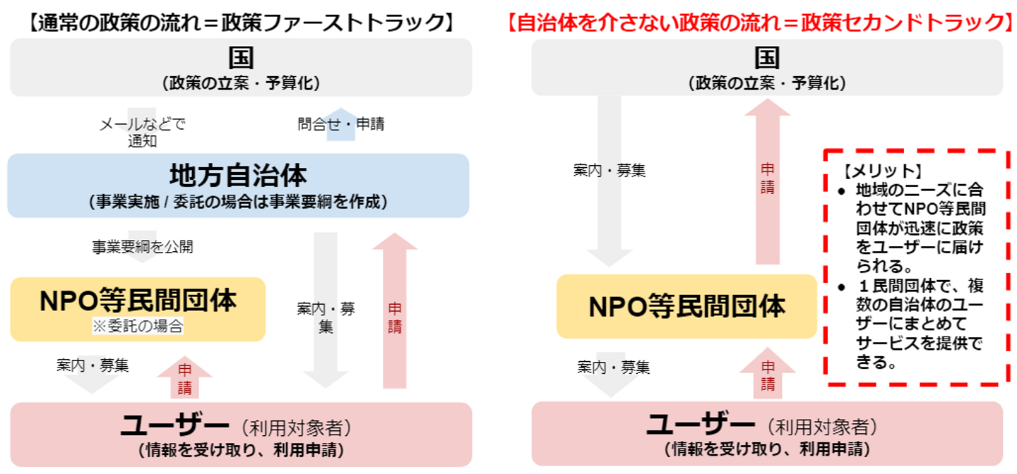 通常は「国→自治体→地域の支援提供団体→支援利用者」というルート(政策ファーストトラック)です。しかし、これではせっかく国が予算をつけてくれても、自治体の人員不足やノウハウ不足などがボトルネックとなり、自治体が新しい支援事業を導入できず、利用者まで支援が届かないという問題がありました。これを解決するのが「政策セカンドトラック」です。