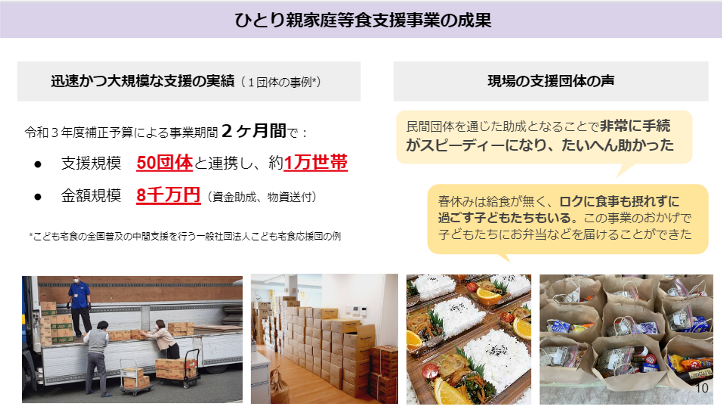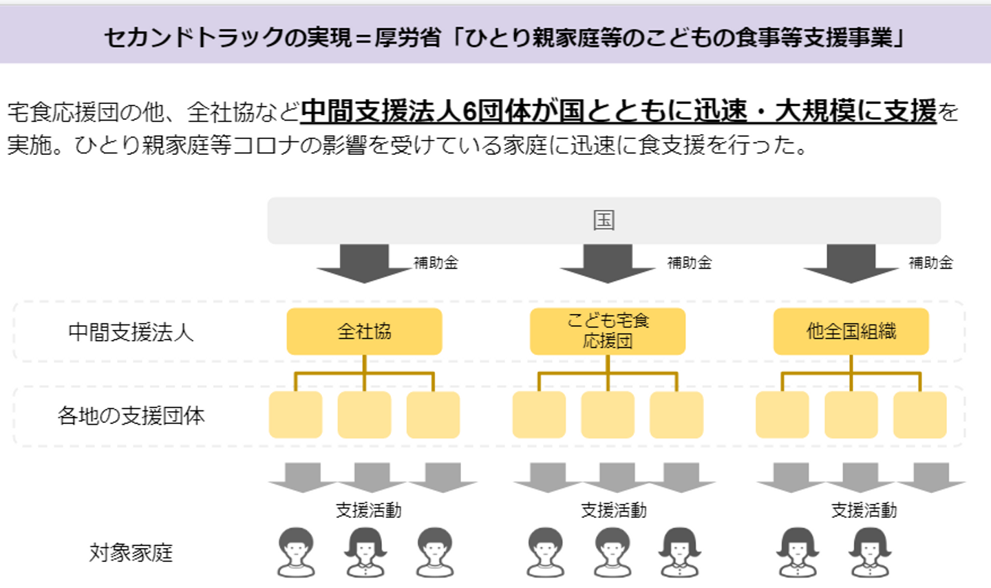 実は、この「政策セカンドトラック」の有効性は既に実証済みです。令和3年度補正予算の「ひとり親家庭等のこどもの食事等支援事業」(予算額22億円)が、こども宅食を「政策セカンドトラック」で実施する事業でした。