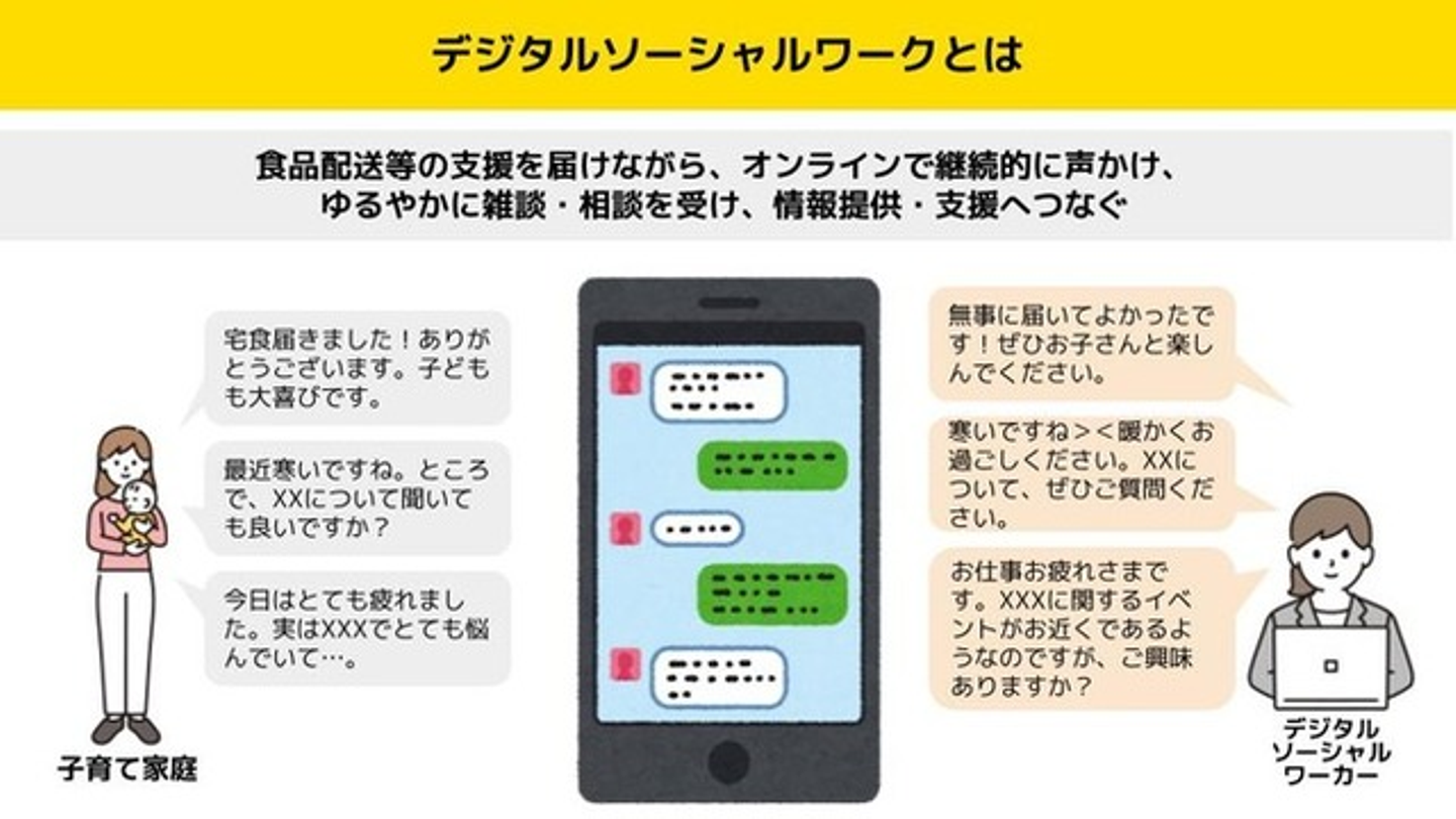 「デジタルソーシャルワーク」は、社会福祉士等の専門資格を有する支援員が、子育て世帯に対してオンラインで継続的に声かけを行います。ときには雑談したり、相談を受けたりしてゆるやかにつながり、支援情報を提供したり、必要に応じて行政や他機関・団体と連携して地域の支援につなげます。