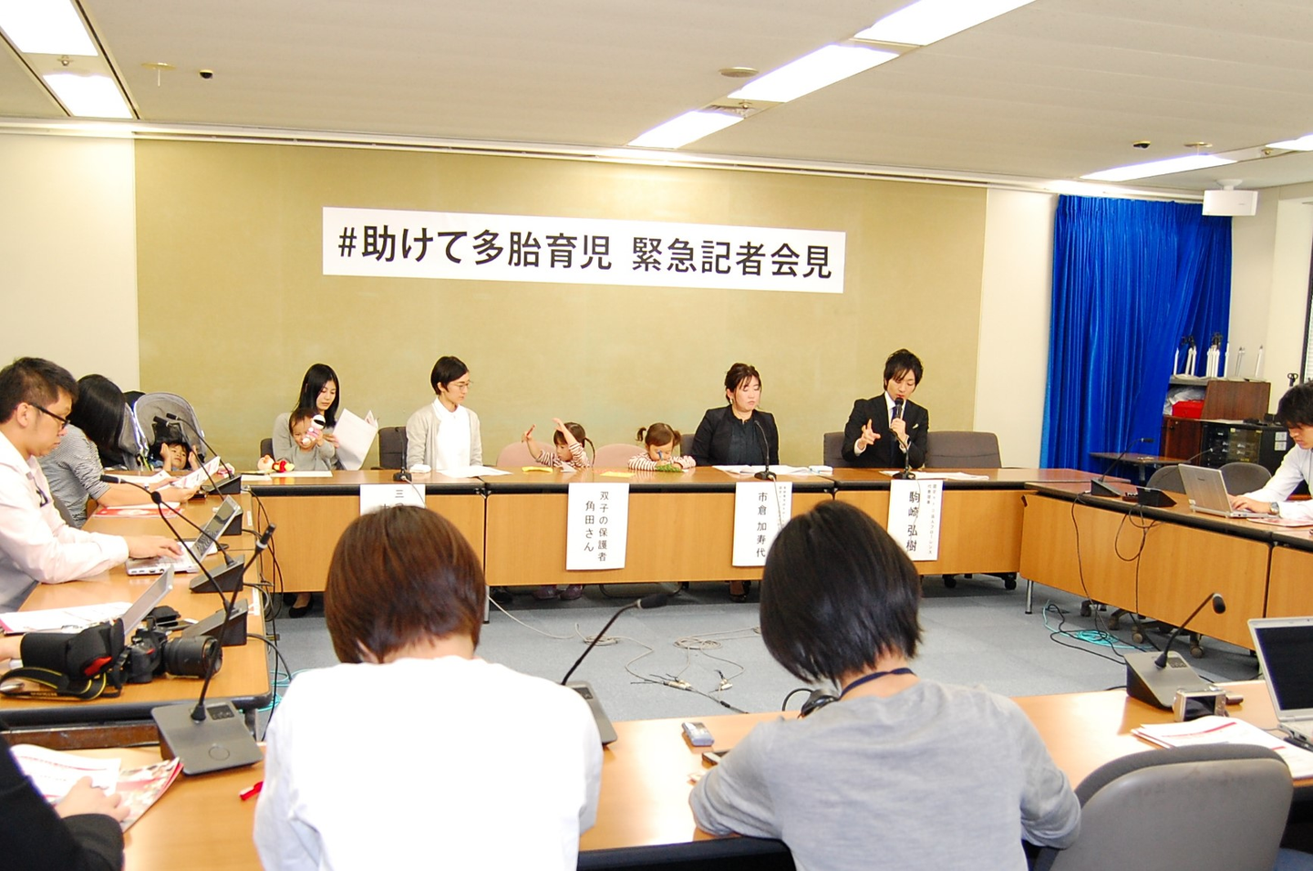 そう書かれた横断幕の下で、双子や三つ子の親子が記者会見を行っていました。