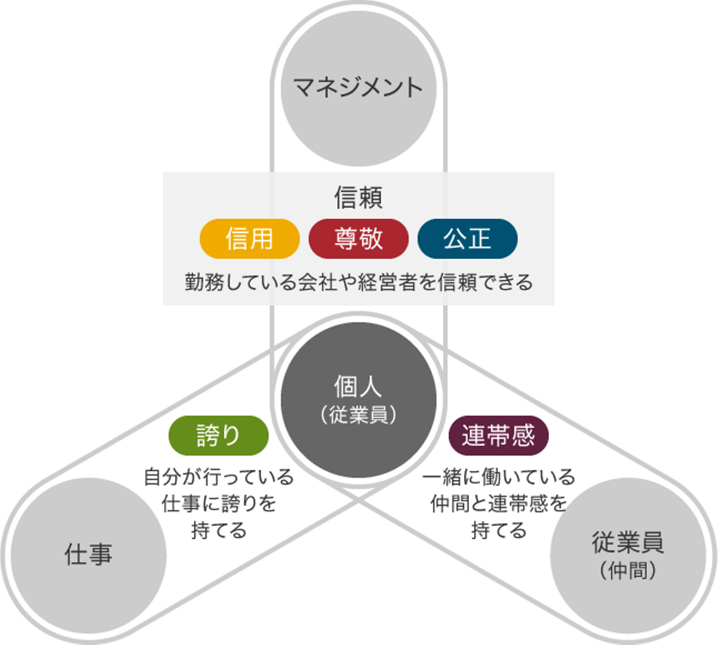 同じ処遇で働いたとしても人によって、その仕事に「働きがい」を感じるかどうかは違うはずで、正確に定義することが難しいように感じられます。GPTWでは、従業員や経営者への取材や調査を通じて、個別性が高い「働きがい」の中で、土台となるものは「信用」、「尊敬」、「公正」、「誇り」、「連帯感」であり、この5つの要素が「働きがい」を構成するものであると位置づけています。