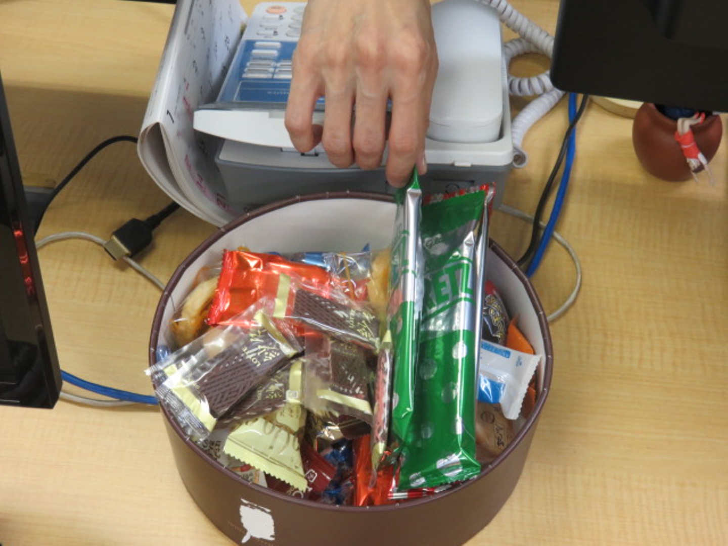 お菓子が大好物な原氏は社員(主に女性社員)から貰い続けたお菓子を頬張る。