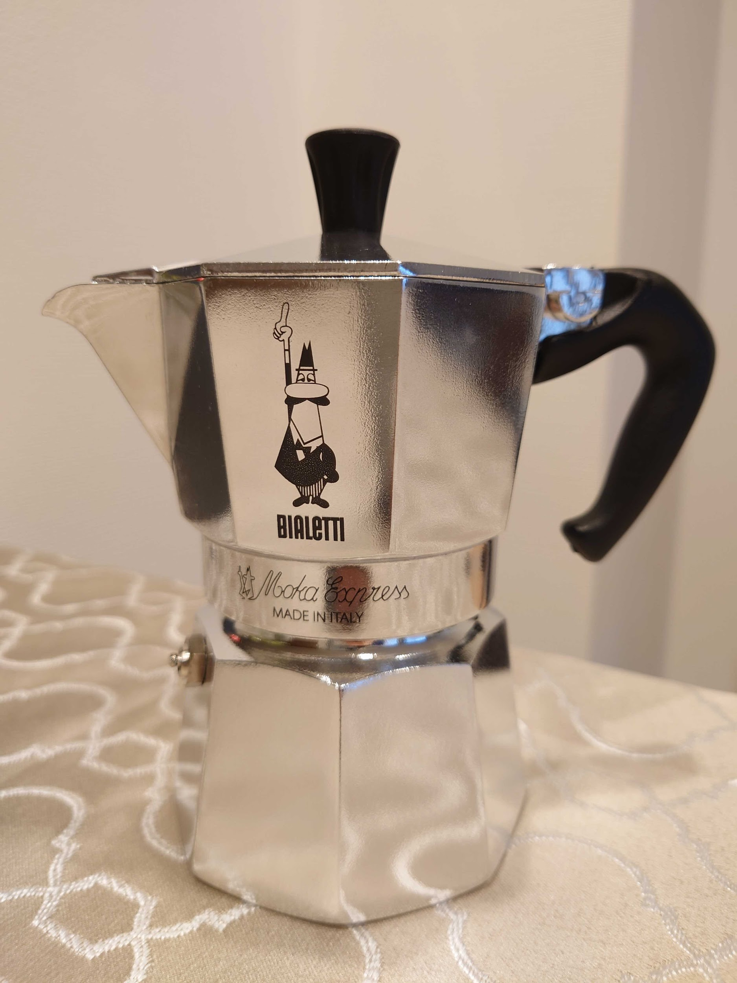 愛用のマキネッタ。これを直火にかけ、牛乳と相性の良いエスプレッソが出来上がる。