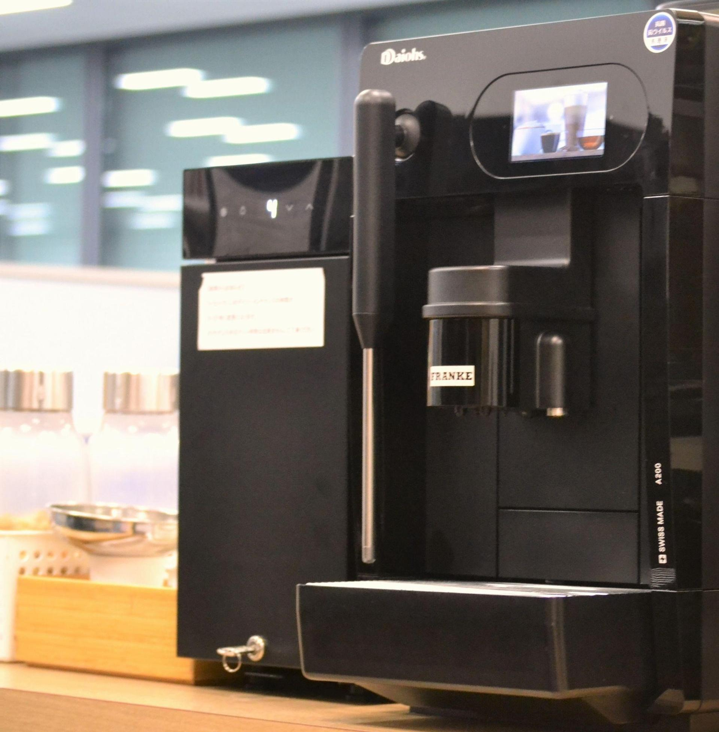フォルシアの自慢と言っても過言でない休憩コーナーの飲み物たち。種類も充実しており、その中でも特に目を引くのはコーヒーマシン。
