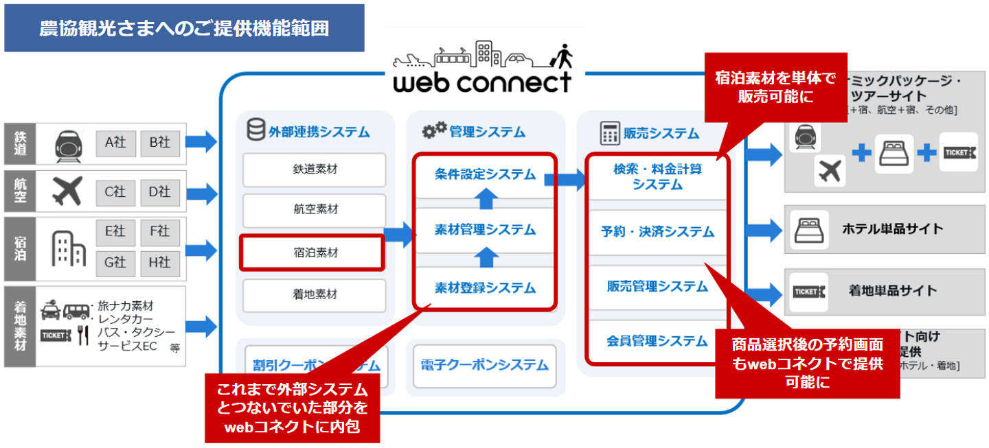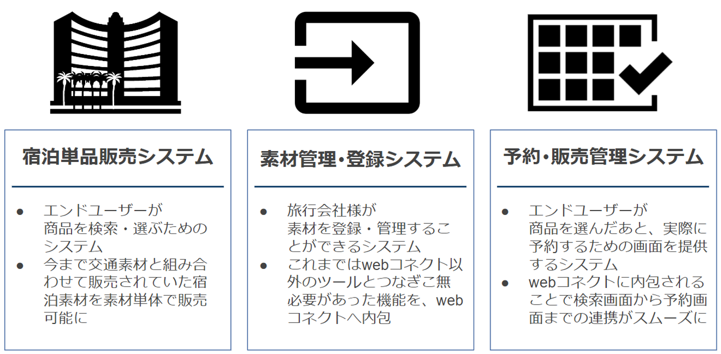 ―これまでの「webコネクト」といえば、ダイナミックパッケージやツアーといった宿泊施設と交通手段とを組み合わせたセット販売における検索システムという印象でした。今回搭載された機能はこれまでの「webコネクト」と様相が違うようですが、新機能「宿泊単品販売システム」、「素材管理・登録システム」、「予約・販売管理システム」の『推しポイント』を教えていただけますでしょうか?