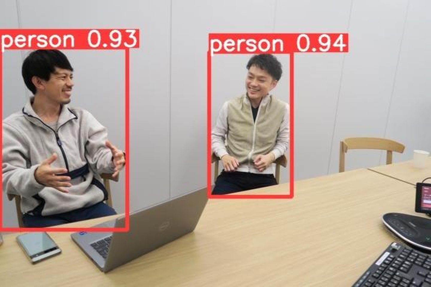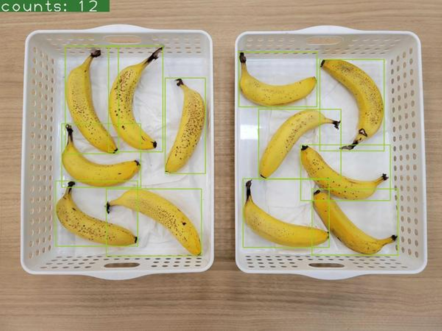 画像に写っている指定の物体の個数をカウントします。工事現場での資材数カウントや水槽の魚のカウントなどに用いられます。例では弊社休憩スペースに置かれているバナナの本数をカウントした例です。バナナの向きに関わらず正しくカウント出来ていることがわかります。また、例ではバナナだけですがバナナとリンゴをそれぞれ数えるといった芸当も可能です。