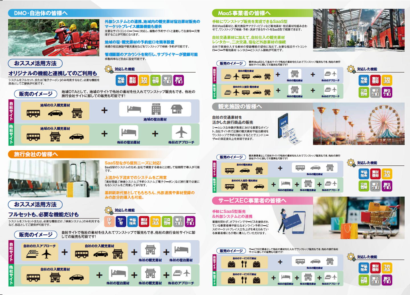 パンフレットの中面は、業界別の提案になっており、「DMO・自治体の皆様へ」「旅行会社の皆様へ」「MaaS事業者の皆様へ」など、それぞれの業界の皆様へ対しての提案をホームページと連動して掲載しています。