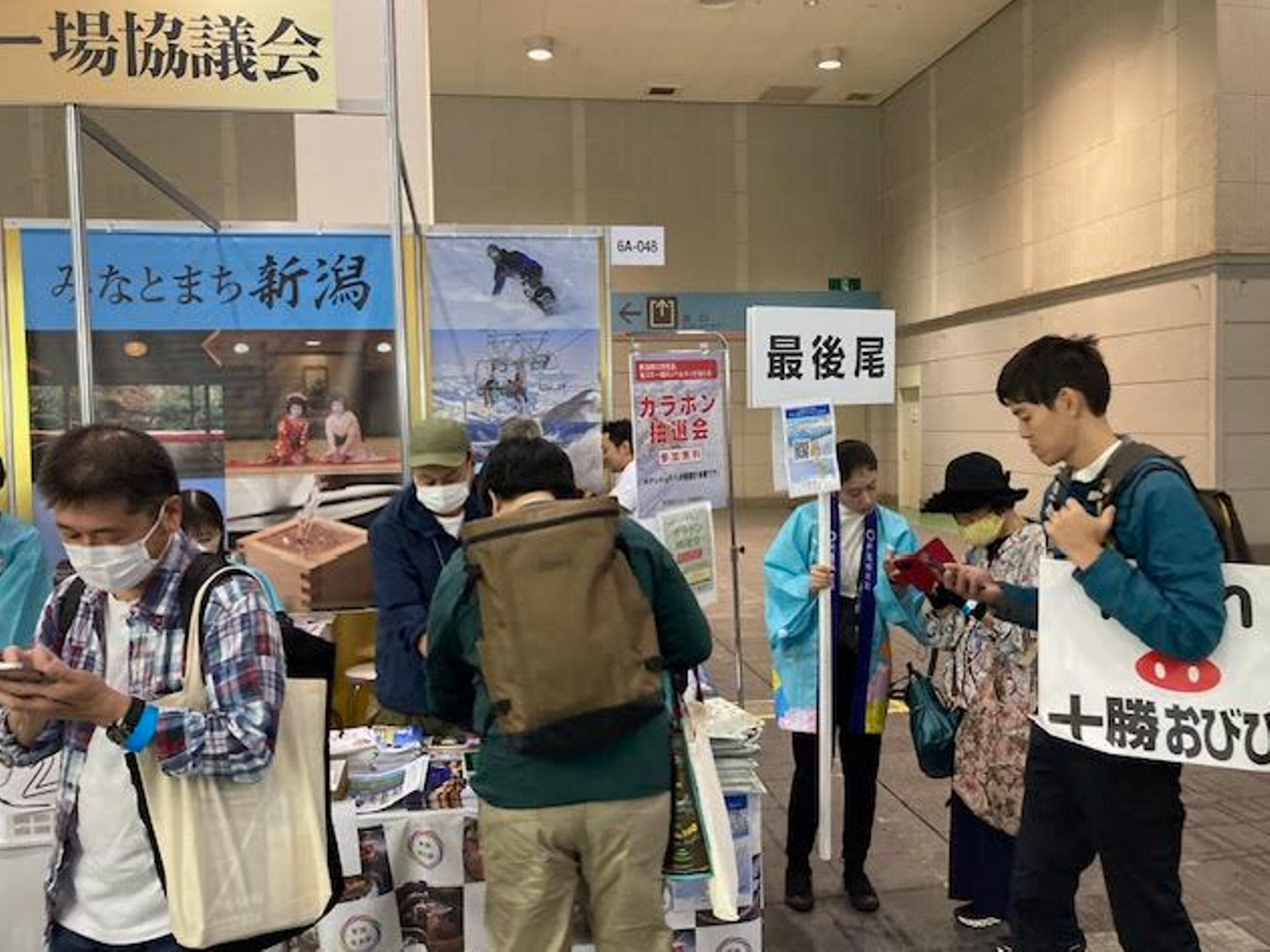 こんな感じで、SNSでフォロー等すると、ガラポンができ、その土地のノベルティまたはお菓子などがもらえます。これを各ブースで行うと...もう腕2本では足りないほどのお土産がもらえます。なんだこれ的な不思議なノベルティも多く、集めるだけでとても楽しいです。中には、地酒を振舞ったり、その場で食べられるものを配るブースもあります。