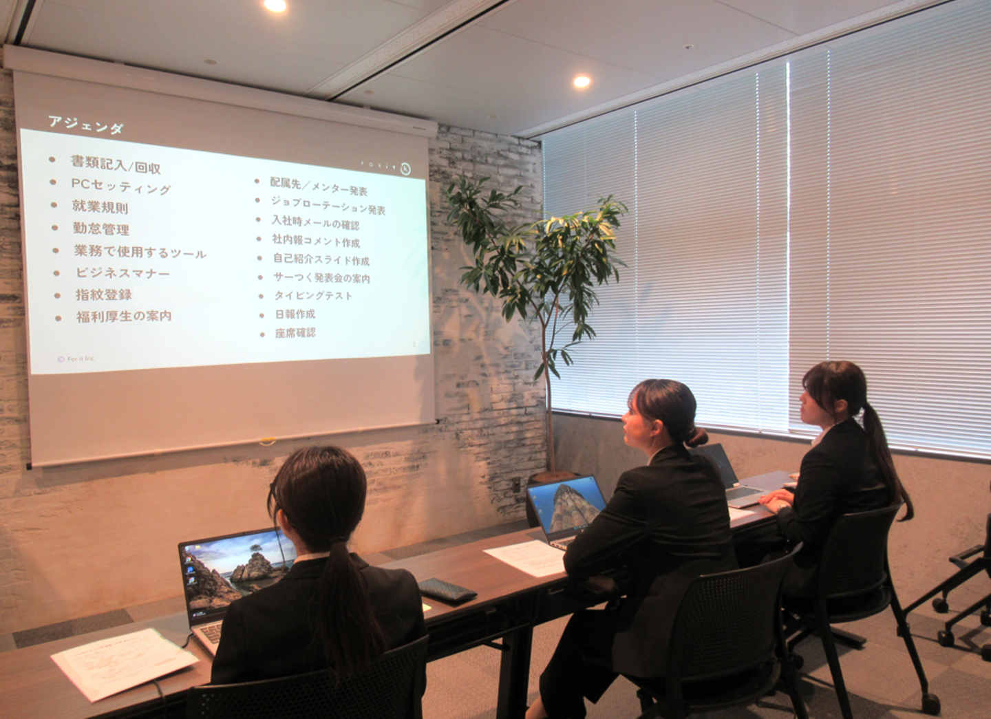 午前中は、PCのセットアップから始まり、就業規則や勤怠管理の説明、そして社会人の基本であるビジネスマナー講座まで座学中心のオリエンテーションを行いました。