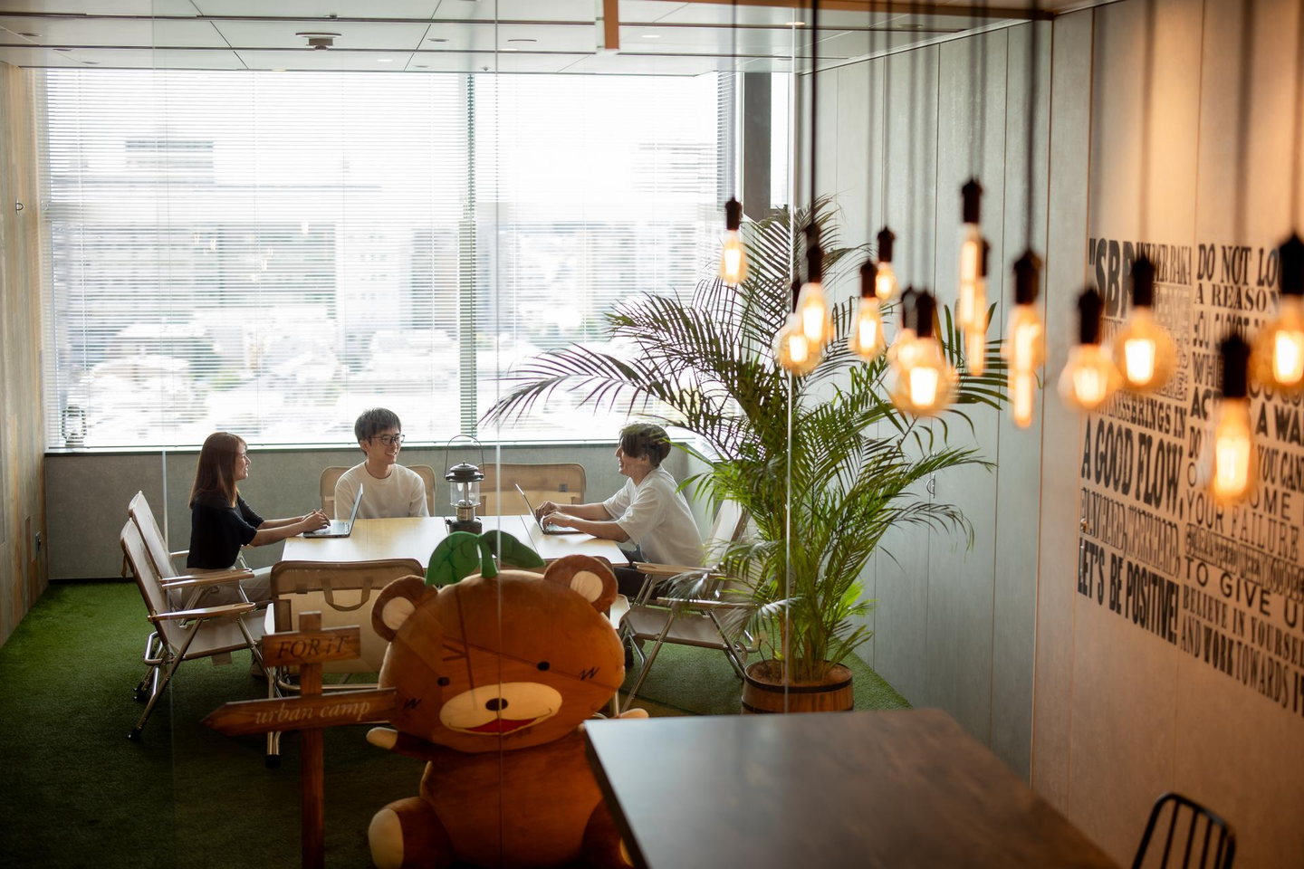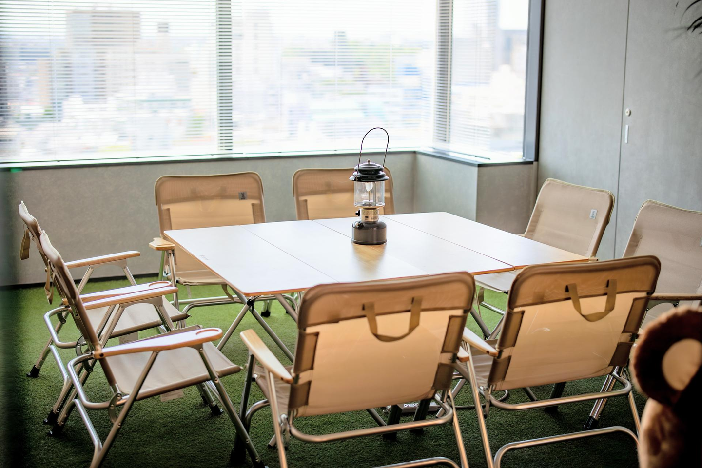 フォーイットでは、「TAKIBI」というアウトドアテック事業も展開しているため、一面に芝生が広がるアウトドア風の会議室があり、渋谷にいながらもアウトドア気分を味わうことができます。
