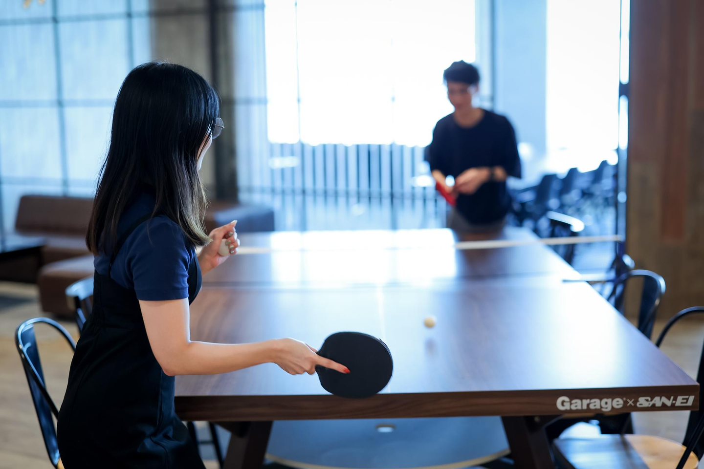 写真右下のデスクは、業務時間終了後は卓球台としても使用可能です。