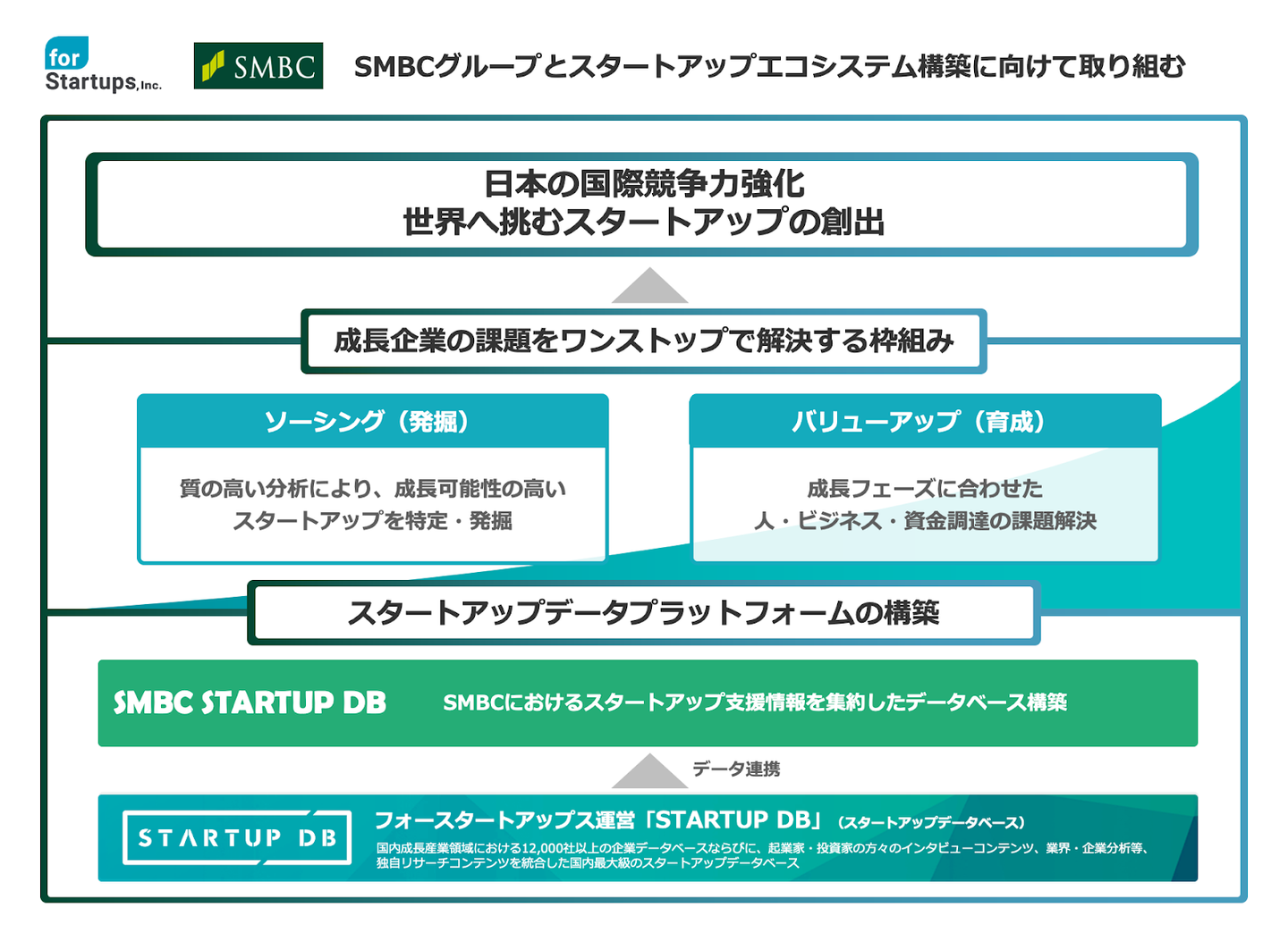 「SMBCグループとの提携」リリースより まずは、フォースタートアップスの『STARTUP DB』が保有するデータと、SMBCグループがもつネットワークを掛け合わせ、成長可能性の高い起業家・スタートアップを発掘・特定するための「情報」を整備します。成長させるべき起業家・スタートアップを見つけたら、両者共同で人材支援、およびオープンイノベーション支援を実施。SMBCグループが保有する融資を含めた強力な資金提供能力のほか、戦略的な共同資金支援の枠組みも視野に入れています。 その他にも、日本の成長産業に資本を投下すべきという志を共にする、大手企業やコンサルティングファーム、これまでも同じ志をもって協働してきたベンチャーキャピタル(VC)など、様々な企業体と連携し、成長産業に集中支援する取り組みを実現すべく、今、話を進めているところです。どんなにそれぞれの企業が事業を伸ばし、利益を上げようとしても、日本経済自体が沈んでは元も子もないですから。 このままの日本の姿に危機感を抱く方々と、「真にいま私たちがやるべきことは何か」議論し、次の展開に向けて動き出しています。
