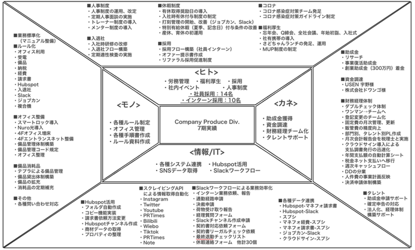 単純なバックオフィス機能としてではなく、攻めの機能を有し会社全体を底上げし前進させる機能として存在し、100人の次世代プロデューサー集団をつくるということがミッションです。(経営企画や事業開発も当然ここに含まれます)