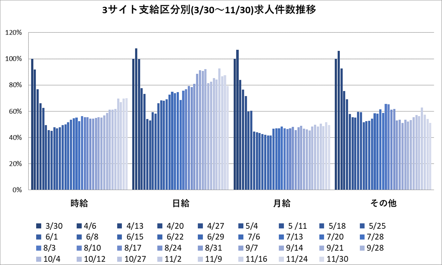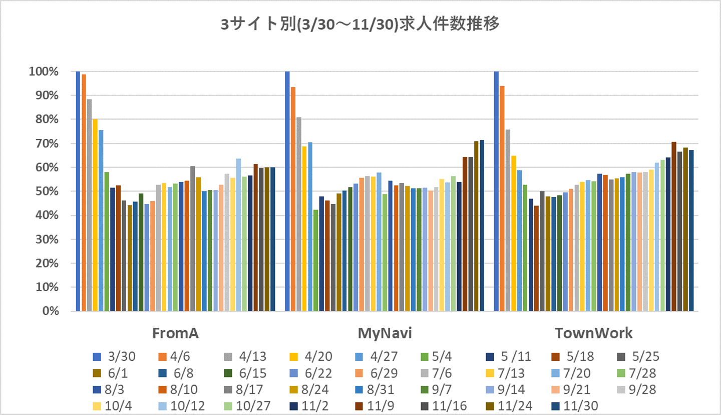 方正株式会社では、【客ココ便利くん】という求人広告代理店様向けのサービスを展開している。その「客ココ便利くん」を用いて、フロムエー、マイナビ、タウンワーク・バイトルに掲載されている求人情報を元にいくつかのグラフを作成してみた。