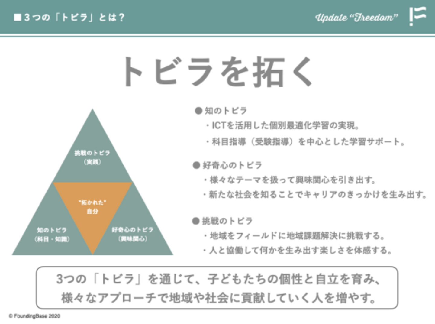 ■ Founder ■ MISSION MISSIONとは、FoundingBaseの目的地であり、FoundingBaseが存在する理由です。 全ての事業活動の目的は、「自由」をUpdateするためです。 私たちの考える「自由」とは、自らの意志で未来を創っていくこと。 他の人や他のコトに由って今があり、未来が創られるのではなく、 自らの意志に由って今があり、自らの意志が未来を創る。 自ら選択した今を愉しみ、今に没頭し、未来の可能性を開拓する。 それこそが、「自由」の源泉だと考えています。 ■ Value