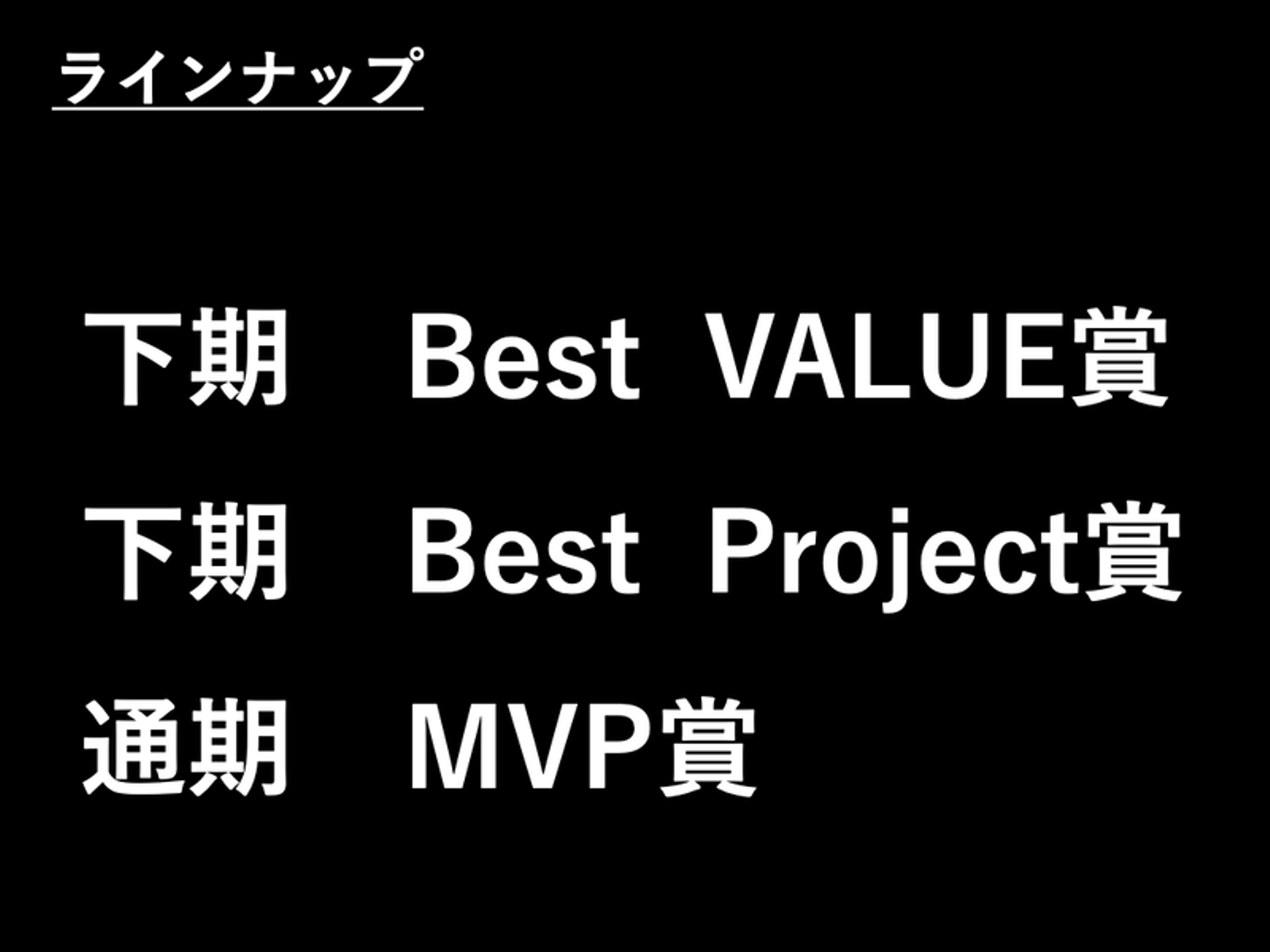 Best VALUE賞:最もVALUEを体現し、成長を遂げた個人に贈られる賞Best Project賞:「自由」のUpdateにつながるProjectを推進した 個人/チームに贈られる賞MVP:MISSION実現に向けて、最も成果貢献した個人に贈られる賞