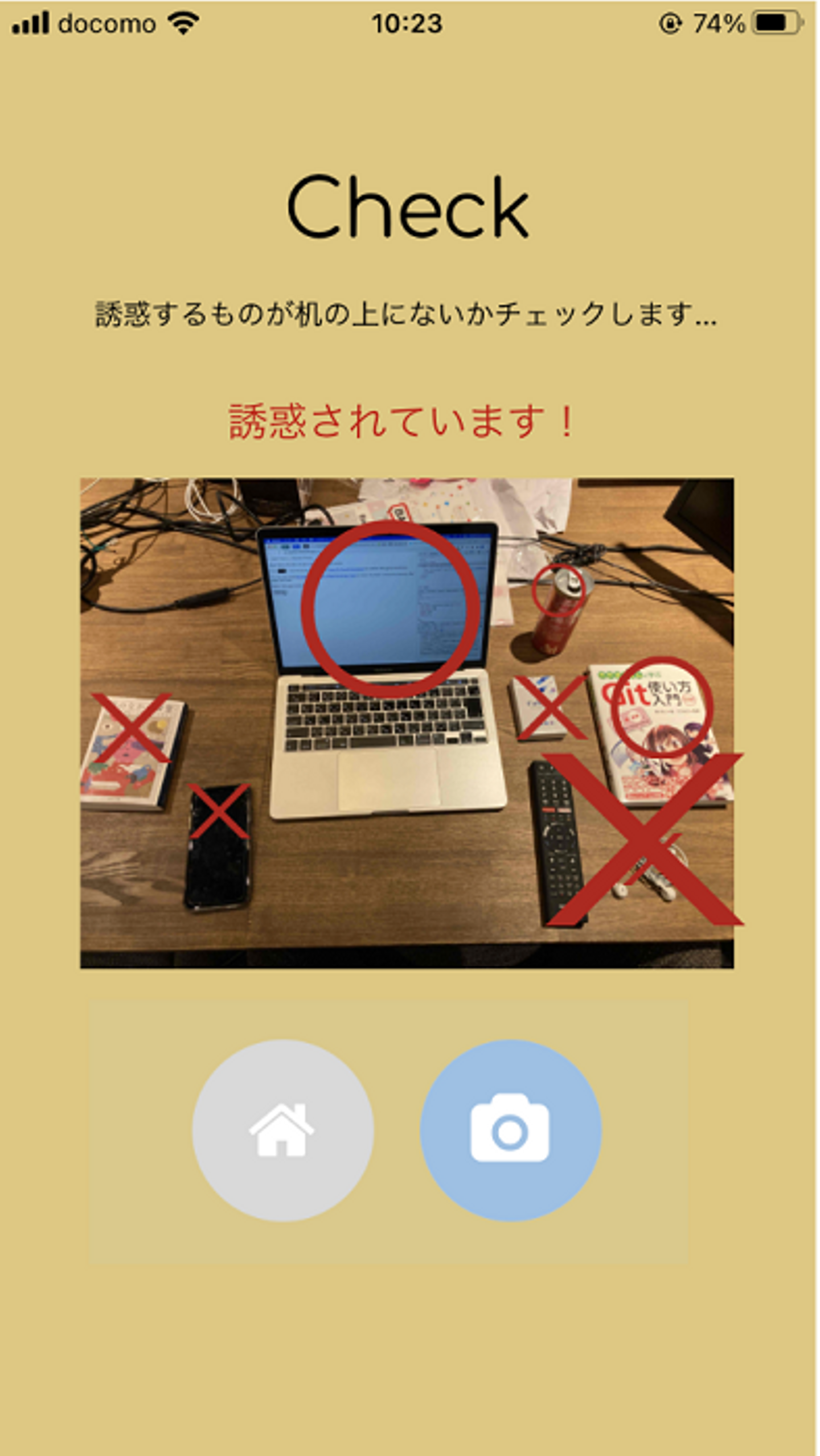 事前に「誘惑になる」と設定しておいたものに×印が表示され、逆に作業に必要なものには◯印が表示されます。