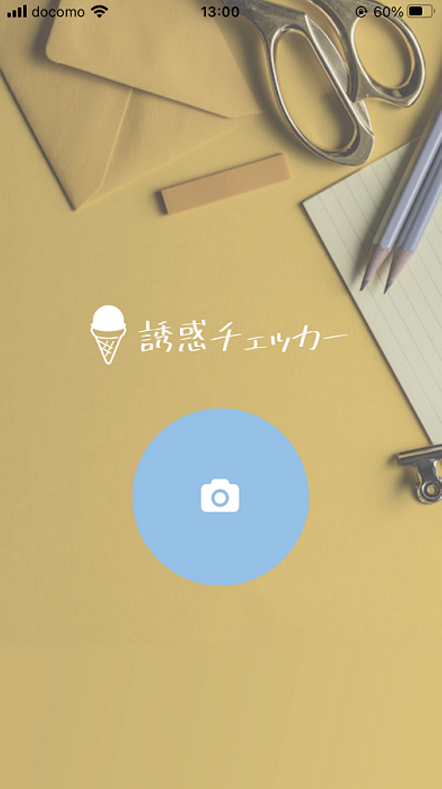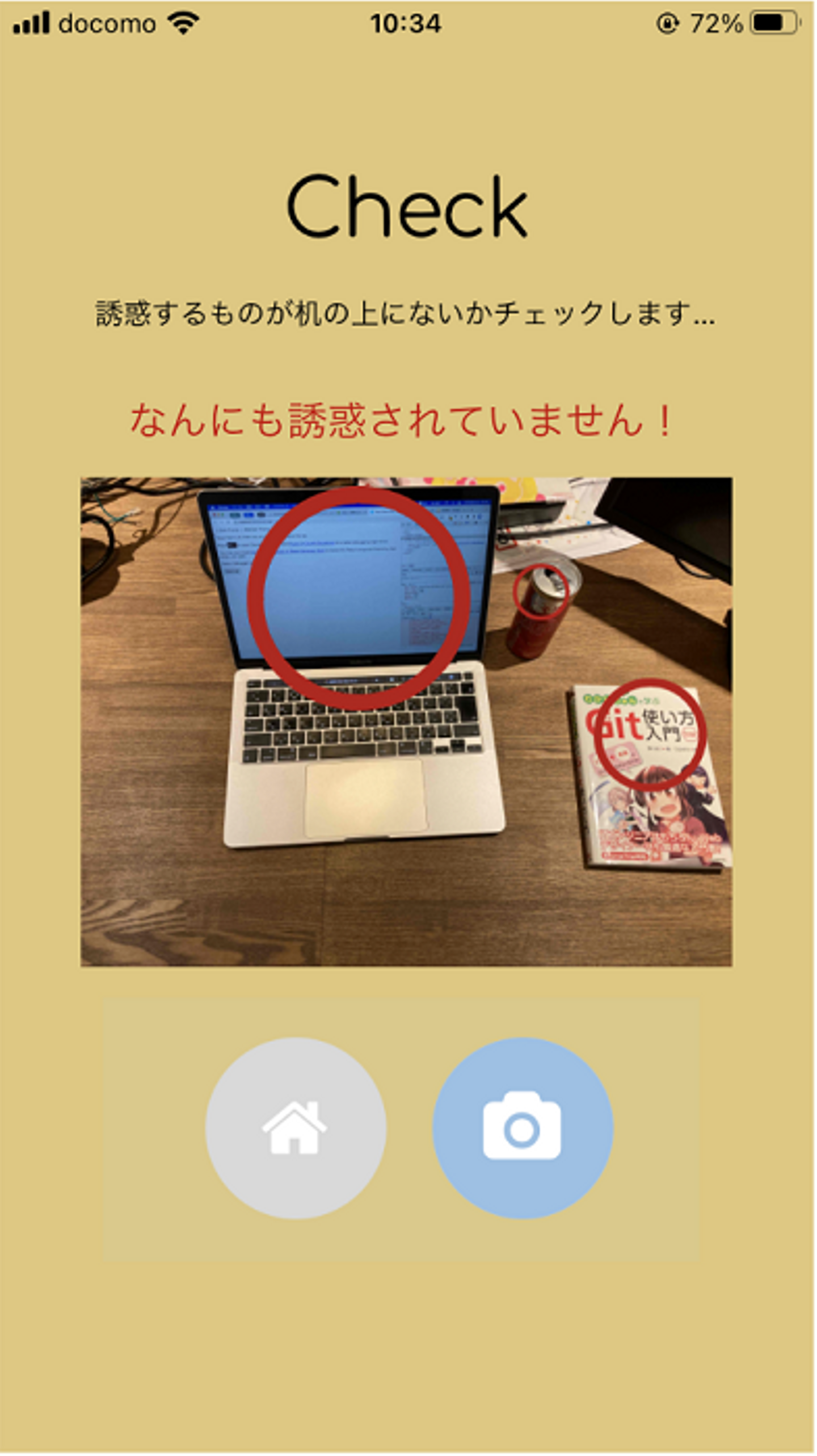 下の写真は、アプリのTOP画面です。ボタンを押すとカメラが起動し、写真を撮影すると…