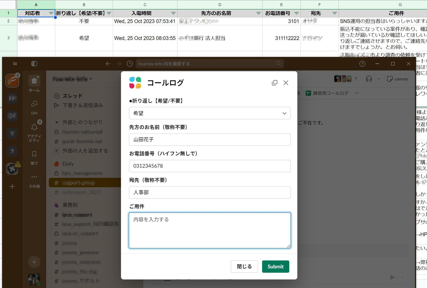・スプレッドシートに応対履歴を残す電話対応業務ではSlack上のフォームから必要事項を入力するとスプレッドシートに転記される仕組みを作ったところ、入力漏れや誤って前の行を消してしまうなどのミスが発生せず、品質向上につながった